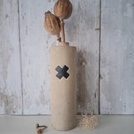 Fired to stoneware temperature (1280C) with a satin white glaze over printed accents of pale blue and orange underglazes. Would suit small dried flower sprigs but is also watertight and has a base.