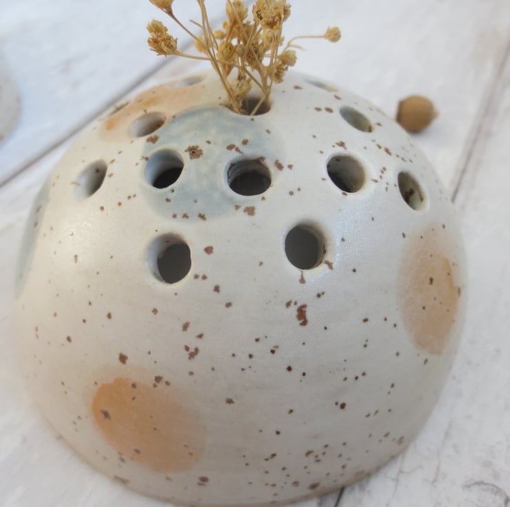 A small hand built domed flower frog with 15 holes, made from speckled buff coloured clay.