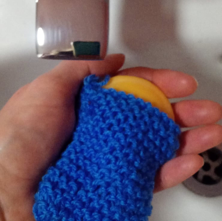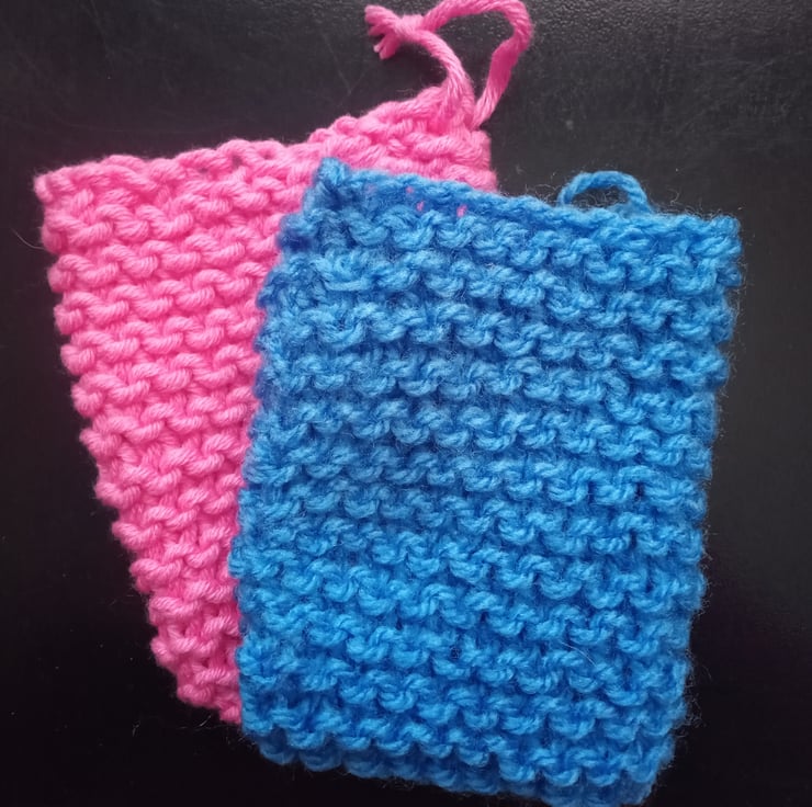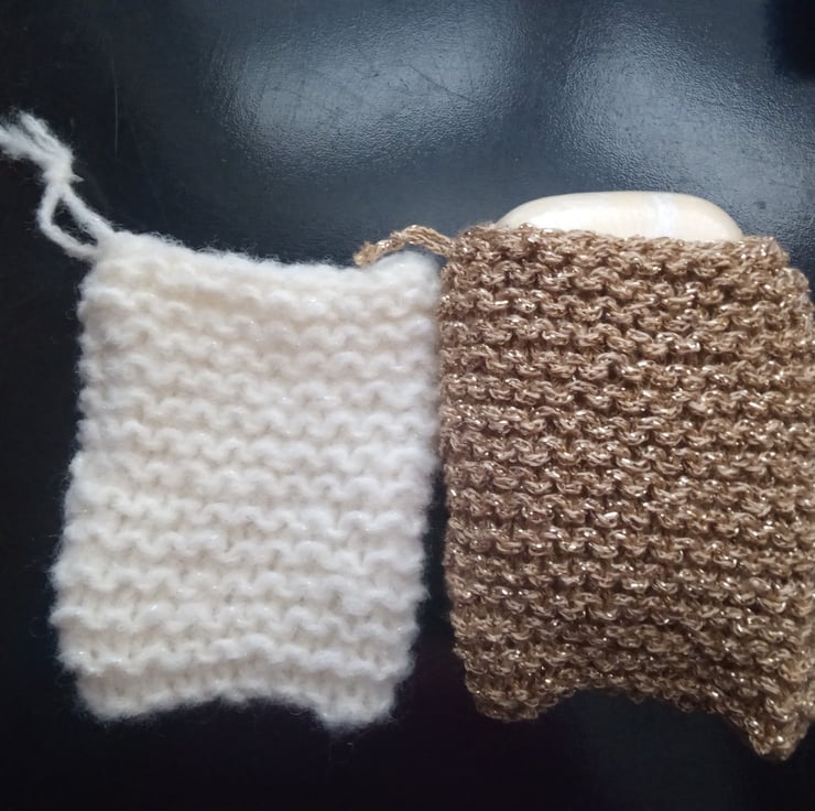 Knitted bag for bar of soap/shampoo, use with a new bar of soap or collect small pieces of soap together to help the soap not to get messy. Also acts as a great exfoliator.