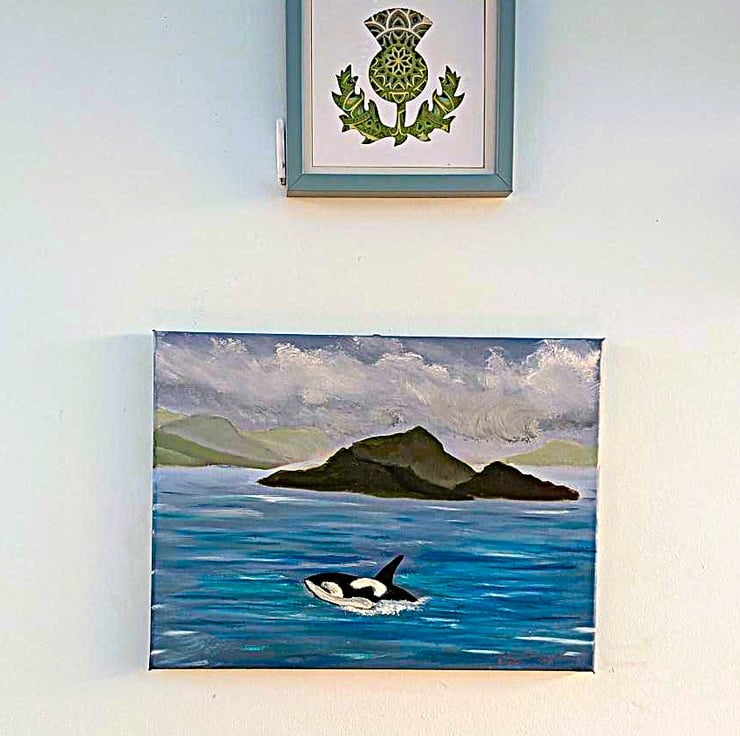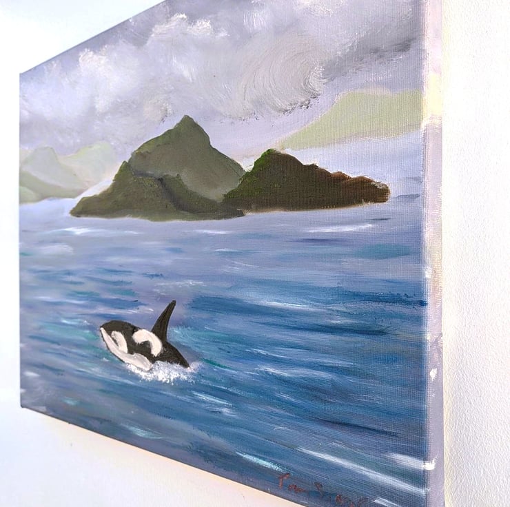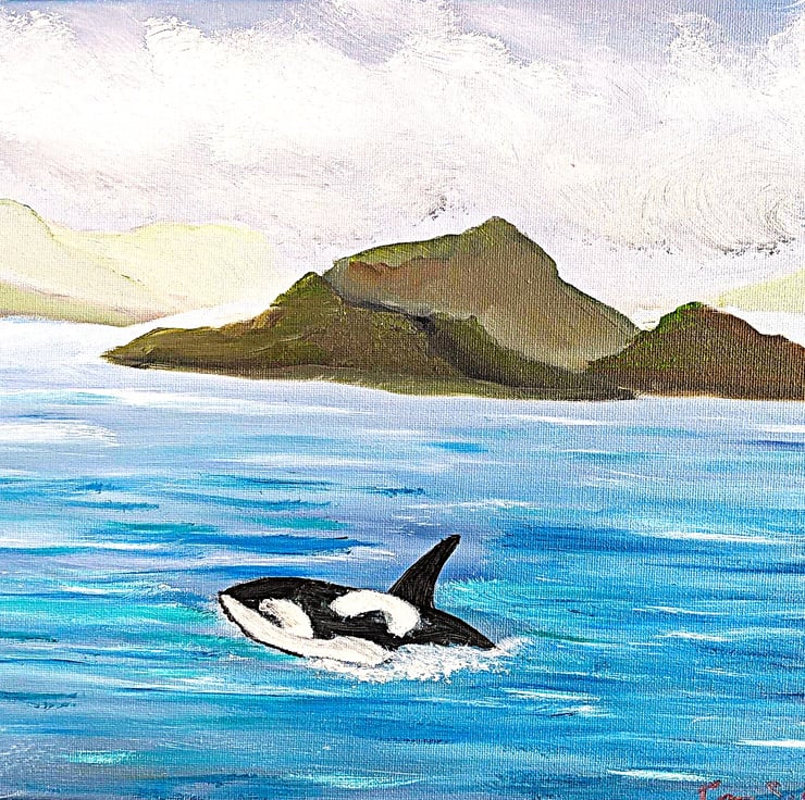 This depiction of an Orca rising off the Northern Islands of Scotland has been painted in Oil, capturing the essence of the incredible views of the Orkney Islands. The inspiration drawn from these stunning landscapes brings a unique connection to this artwork. Orcas are prevalent in the waters around Orkney and the Pentland Firth. An interesting fact about these fascinating mammals is that each of the markings seen is as individual to each Orca as a fingerprint is to a human.