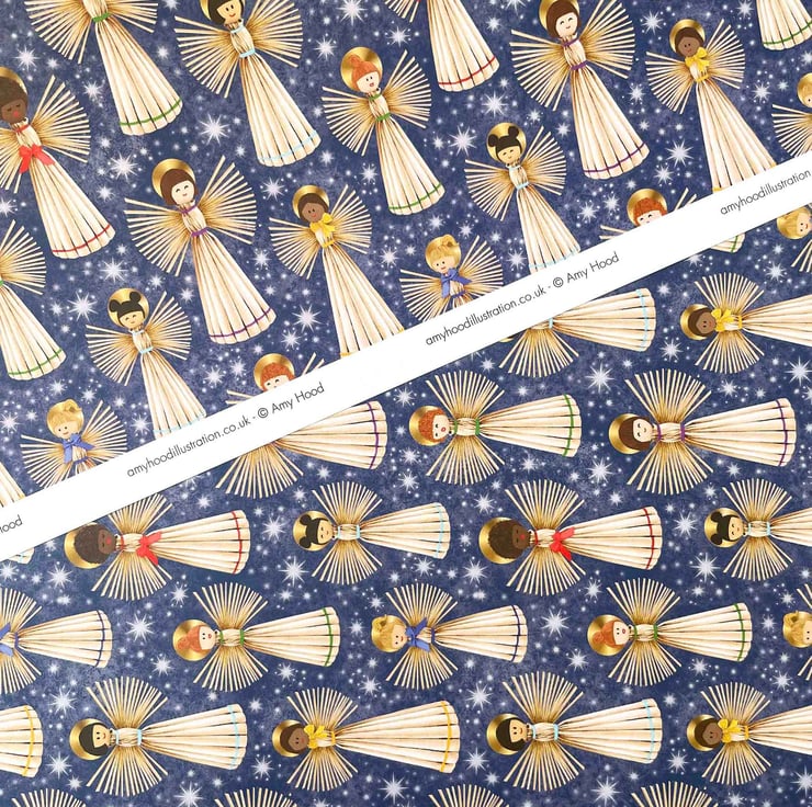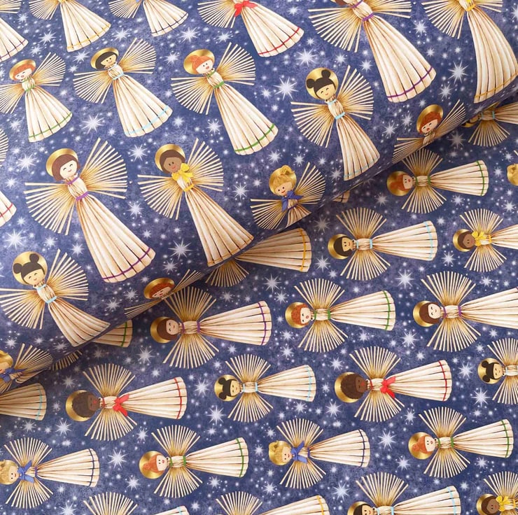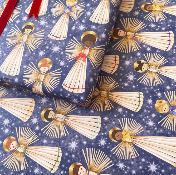 Wrap your gifts with tradition, colour, and heart. This vibrant Straw Angel Christmas gift wrap brings a joyful twist to Nordic holiday traditions. Featuring hand-drawn illustrations of diverse Scandinavian-style straw angels set against a frosty, star-filled night sky, this design blends folk heritage with modern inclusivity.