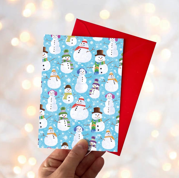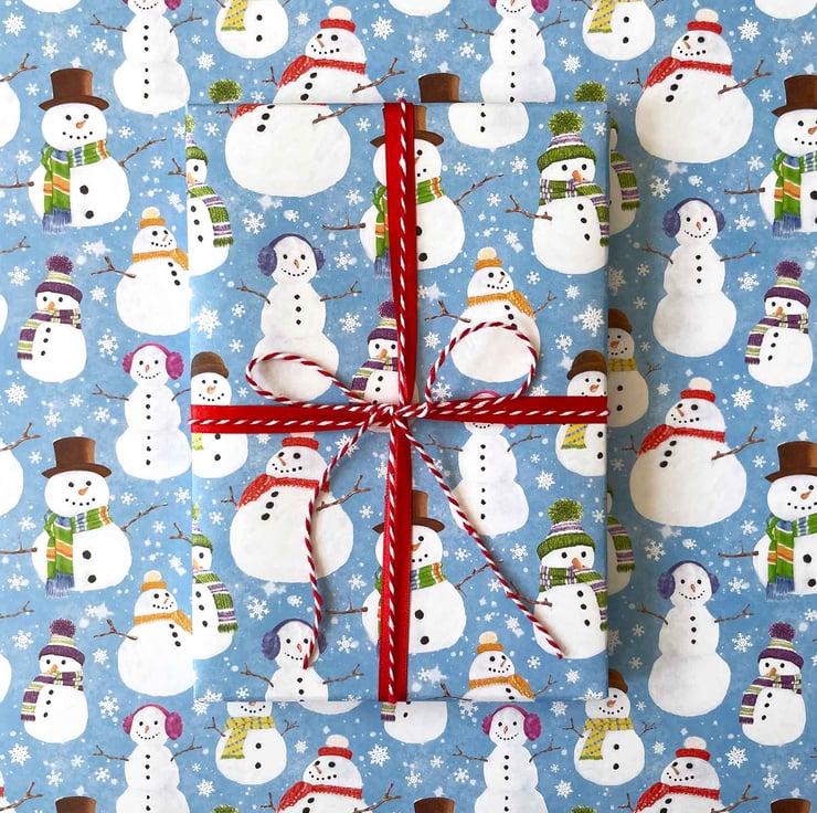 The design is full of cheer — a playful gang of snowmen sporting bright hats, cosy scarves, and jolly earmuffs, all lovingly hand-drawn in coloured pencil against a frosty blue sky sprinkled with delicate snowflakes. Perfect for wrapping gifts for kids, teachers, neighbours, or anyone who loves the joy of the season!