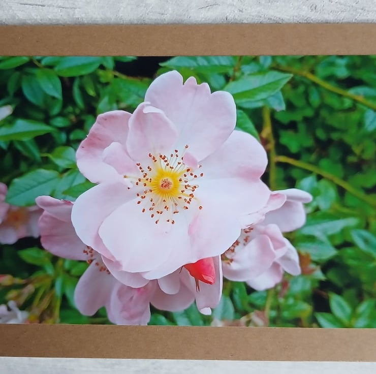 A close up photo of a beautiful, soft pink, climbing rose flower, from a plant that grew in my Dad's garden. I've mounted the 4 x 6 inch photo print onto a 5 x 7 inch Kraft card, that comes, with its envelope, in a cellophane sleeve. Blank for your own message.