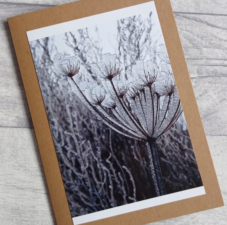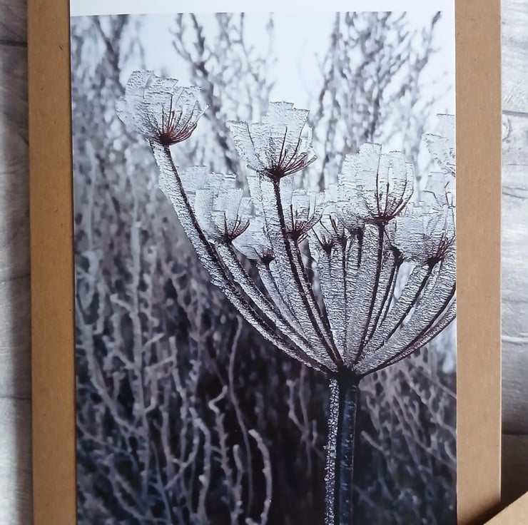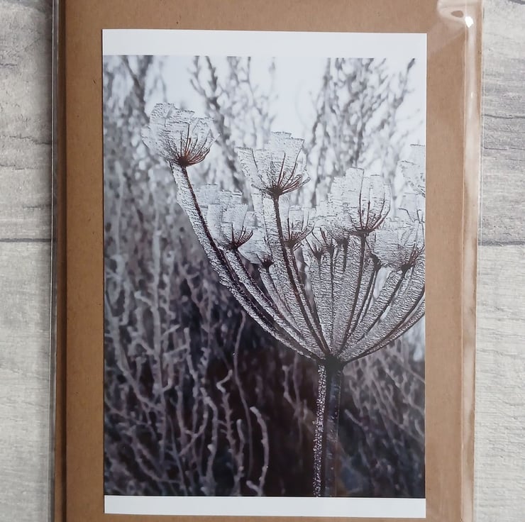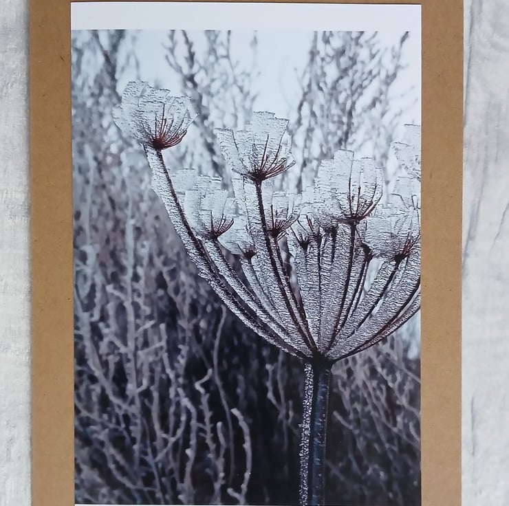 One night in January 2021 we had freezing fog and the following morning one of the local parks had been transformed into a frozen wonderland - this seed head, with it's crystal coating of ice, looked like an ornate chandelier. a 4x 6 inch photo print mounted on a 5 x 7 inch Kraft card, with envelope. Presented in a cellophane sleeve.