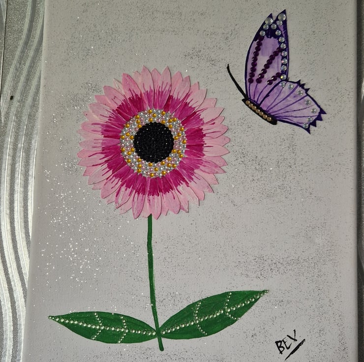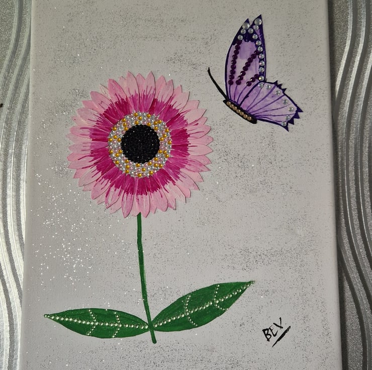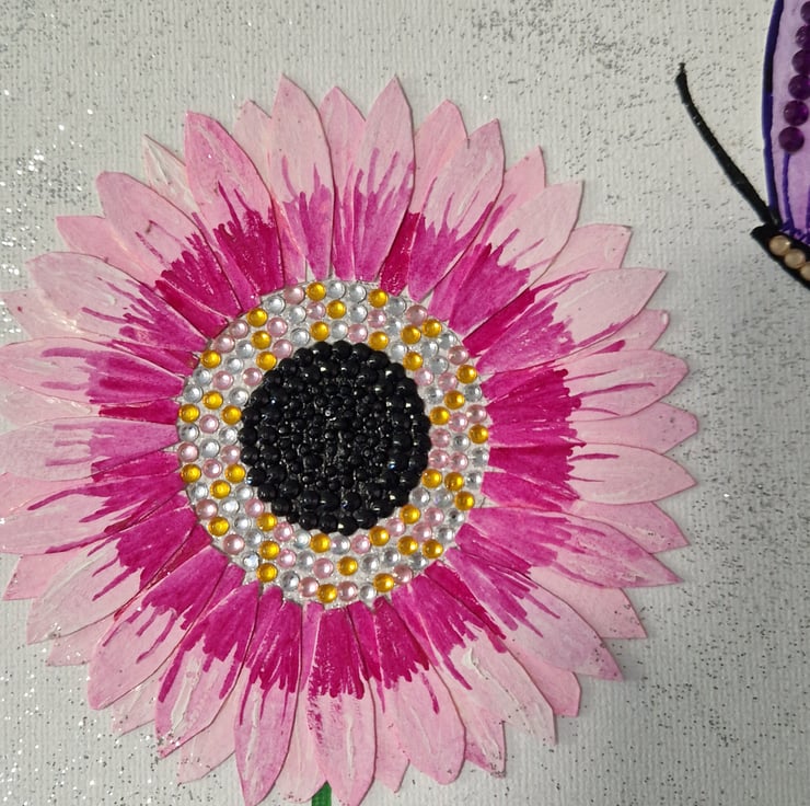 A beautiful hand-crafted collage consisting of a large pink flower and a purple butterfly. On a canvas measuring 12x9 approx.