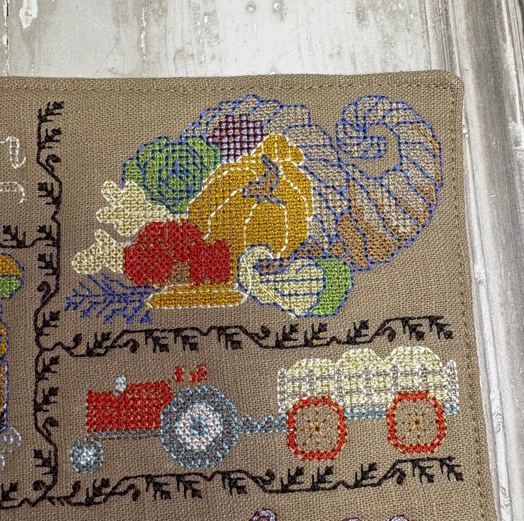 To compliment the cross stitch bowl fillers a cross stitch mug rug for November. Gathering for Harvest time, Cornucopia of produce, tractor and harvest. Measures 7.25” x 5.25”. Made from linen and backed with cotton. Thermal bright heat resistant wadding on the inside.