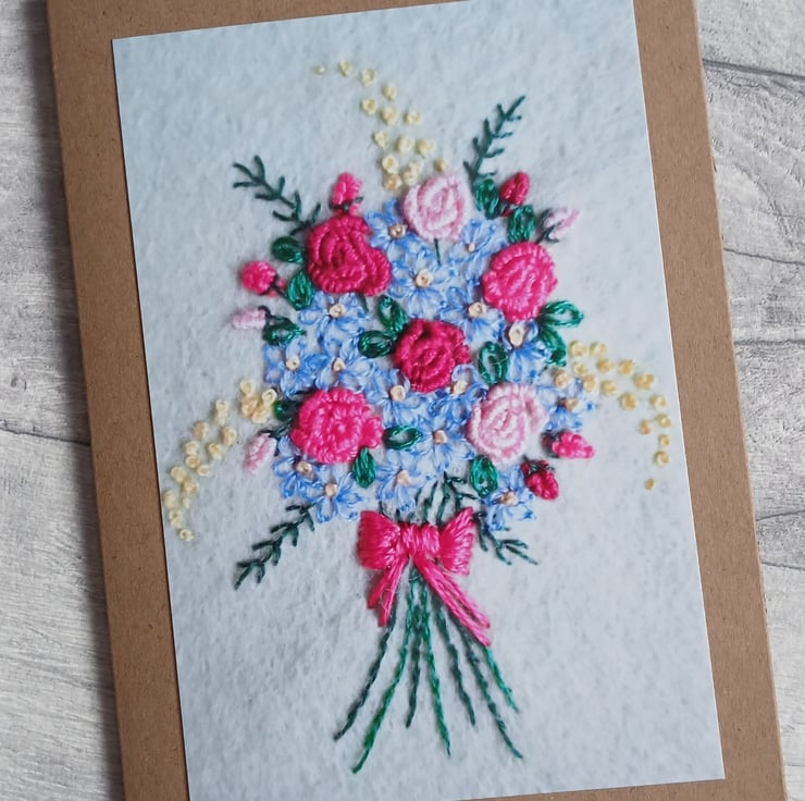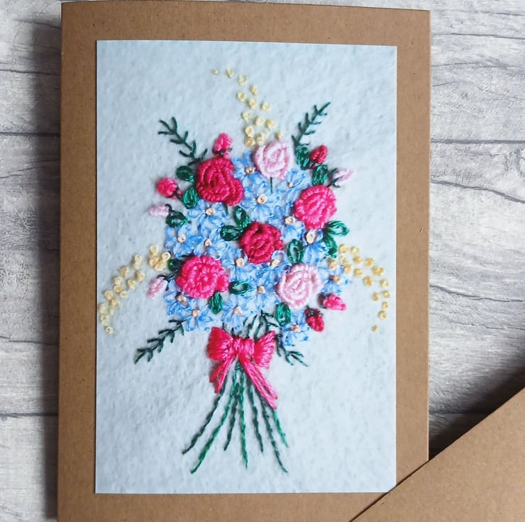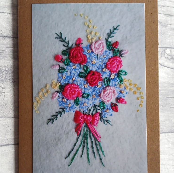 A pretty greetings card featuring a close up photograph of one of my hand embroidered bouquet pictures - perfect for a birthday, thank you or Mothers' Day card. The 4 x 6 inch photo print is mounted on a 5 x 7 inch Kraft card which comes with its envelope in a cellophane sleeve. Blank for your own message.