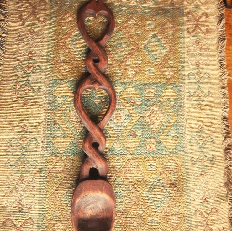 A lovespoon measuring 13x2x1 inches featuring a traditional design of a celtic interlace producing 2 hearts wthin the design.