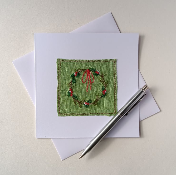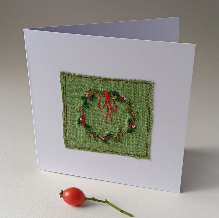 A beautiful, detailed Christmas card featuring an embroidered wreath. It is sewn using free motion embroidery and uses six different colours of thread to add detail and depth. The wreath consists of holly leaves and pine branches, red and white berries, and a beautiful red bow. The design is sewn onto a gorgeous sage green linen, which is then stitched onto a white, recycled card.