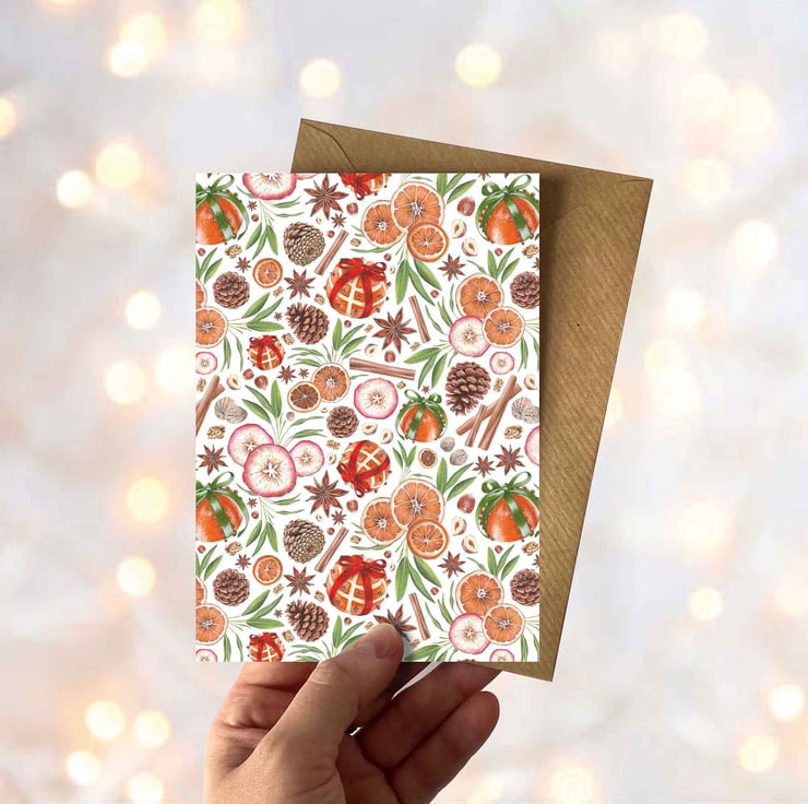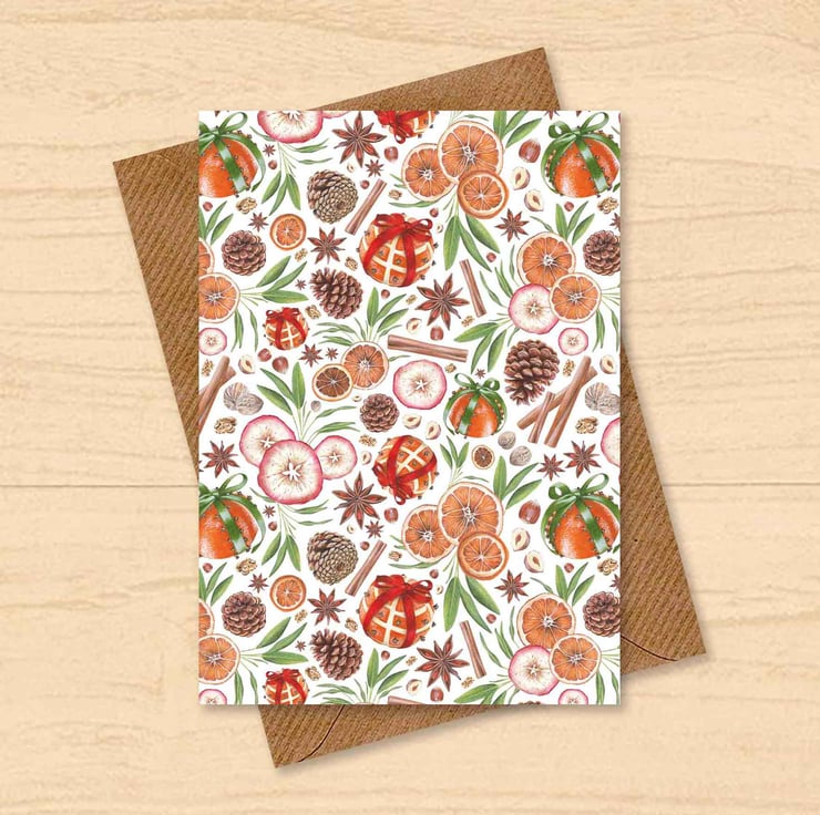 Bring a little festive magic to someone's letterbox with this cosy Christmas card, inspired by the scents of the season! Featuring my own hand-drawn illustrations of warming spices, zesty fruits and fragrant herbs — like cinnamon sticks, star anise, oranges and rosemary — this card smells like Christmas (well, almost!).