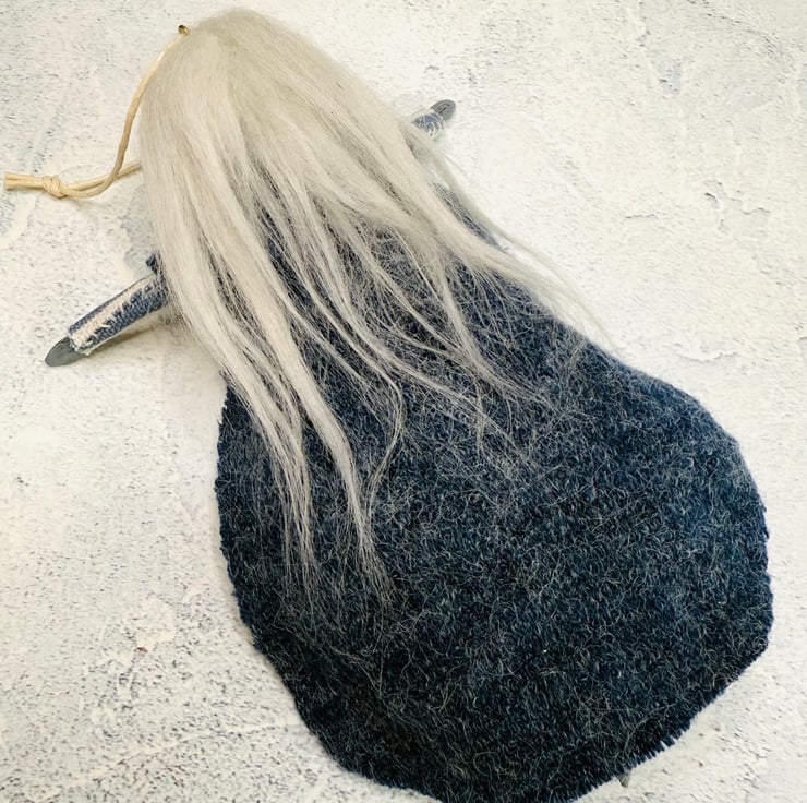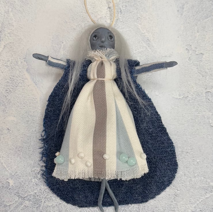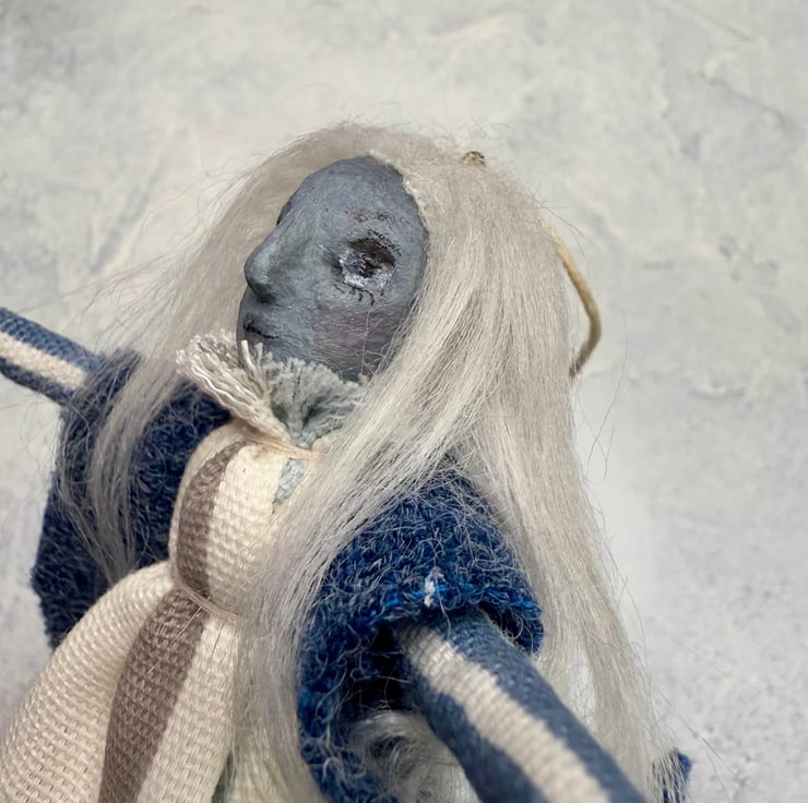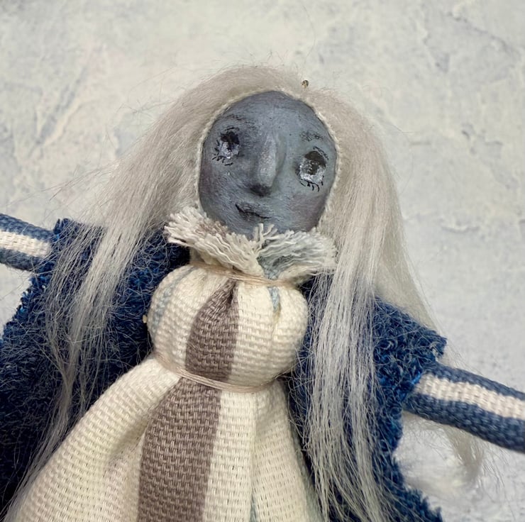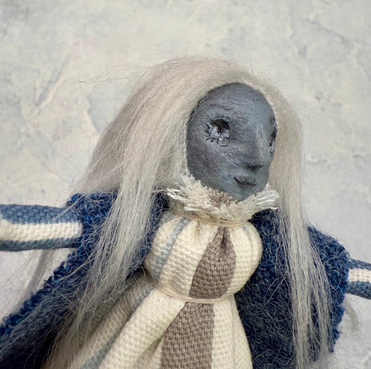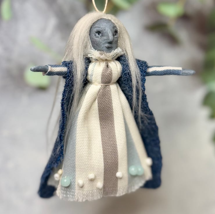 Handmade miniature art doll with faux fur, long hair. This doll has been slowly made using wire armature which allows the head to swivel and arms to be bent and posed for display. This Morgen doll is hand painted with blue, grey skin and pretty face. Morgen wears an upcycled, striped cotton dress, hand sewn and adorned with surf inspired beads and raw edging. The cardigan is hand cut stretch knit. The entire outfit is sewn into place. Morgen comes with a waxed thread hanger for display. Morgen measures roughly 15cm tall. This is for decorative purposes only and not a toy. Witch is sent in recycled or recyclable packaging.