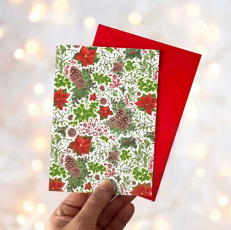 Inspired by the quiet beauty of winter greenery, this design brings together mistletoe, holly, pine and other festive foliage for a simple yet heartfelt touch. I wanted to capture that natural, botanical magic of the season – the kind that feels cosy, nostalgic, and just a little bit romantic.