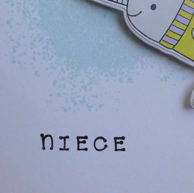 This cute Christmas card for a special niece has been hand stamped and inked in shades of blue, lilac and lime green.