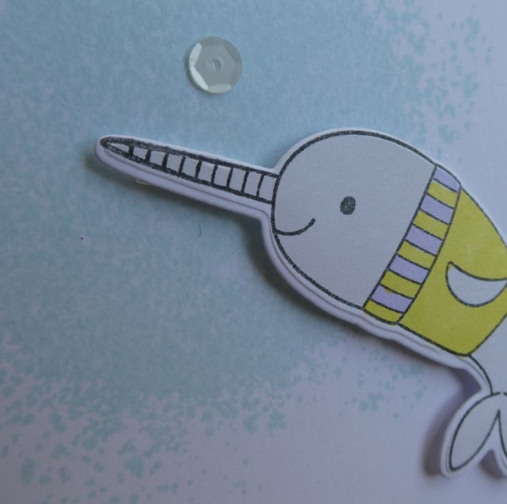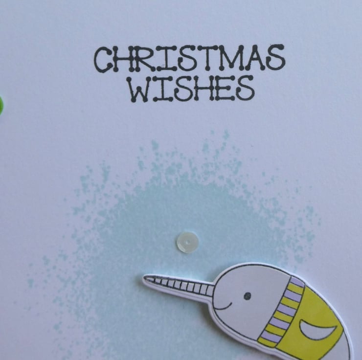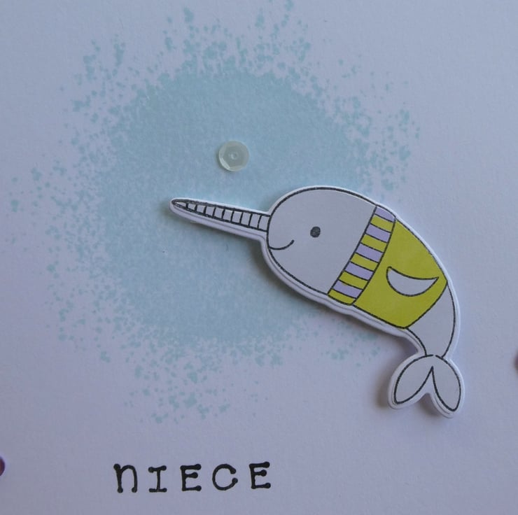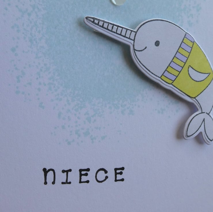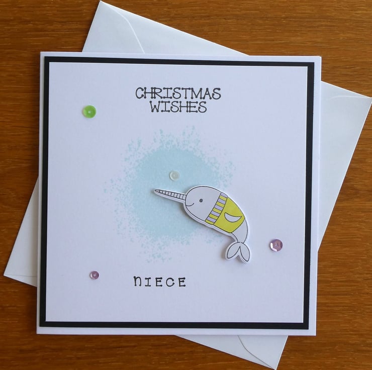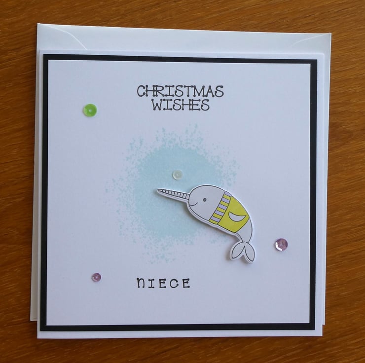 It features a narwhal resplendent in a Christmas jumper slightly raised on foam pads above a pale blue 'splash' background, the greeting Christmas Wishes has been stamed in black archival ink at the top and the word niece at the bottom. The design has been finished with a scattering of green, purple and white sequins.