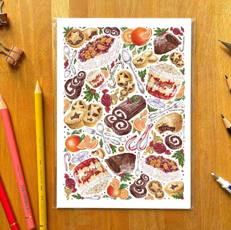 A warm and whimsical celebration of festive flavours, traditions, and togetherness! This cheerful art print is my hand-drawn tribute to all the classic Christmas sweet treats we know and love – from chocolate Yule log and trifle to mince pies, oranges, and candy canes. Illustrated in coloured pencil, it’s full of nostalgic charm and the cosy joy of seasonal indulgence.