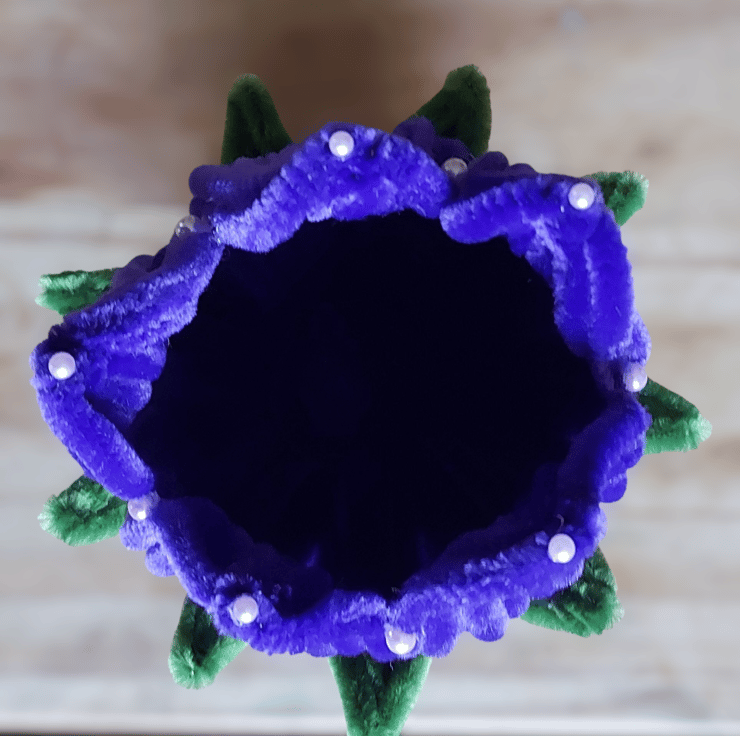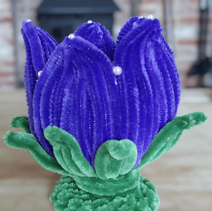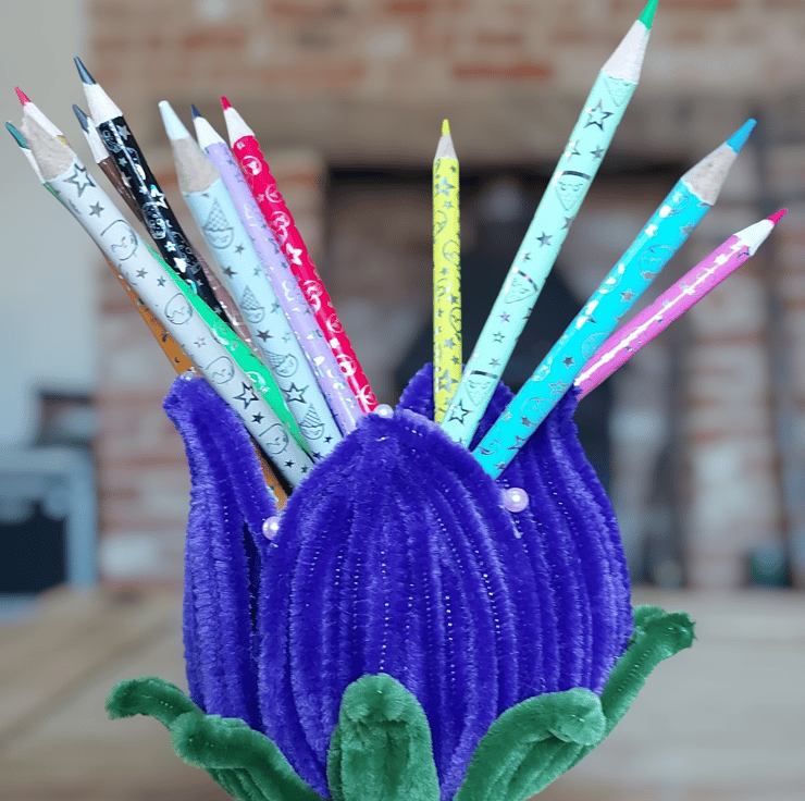 This tulip pen holder was born from my love of creating beauty out of simple, fuzzy pipe cleaners. I wanted something that wasn’t just practical, but also a little reminder of spring on the desk – a flower that never fades. Each petal is shaped and pinned with care, so it stands proud like a tulip in bloom.