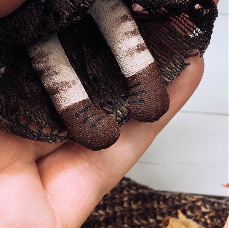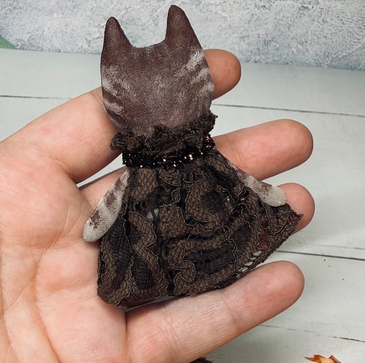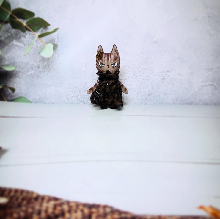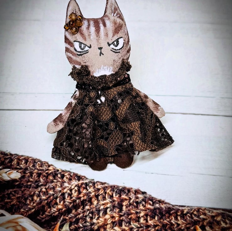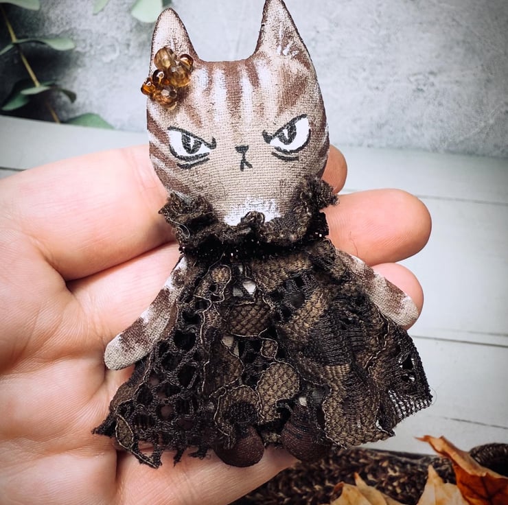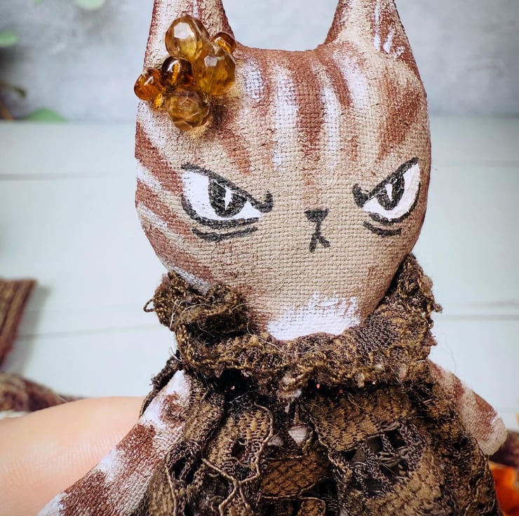 This little tabby is a stuffed cotton doll entirely hand painted and then dressed in upcycled brown lace. The dress is hand sewn with sparkly trim around the neck. Tabby cat also has an upcycled bead headpiece sewn into place and painted boots. Kitty measures roughly 8.5cm tall and comes in recycled or recyclable packaging. This is for decorative purposes only and not a toy. If you’d like a hanger please choose from the option.