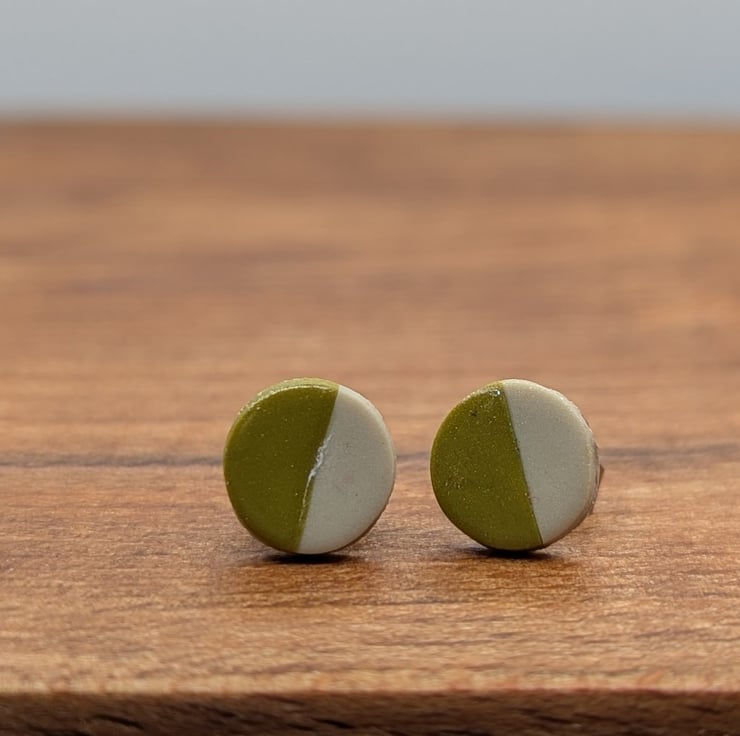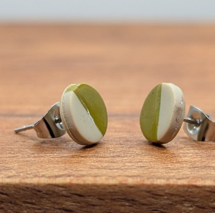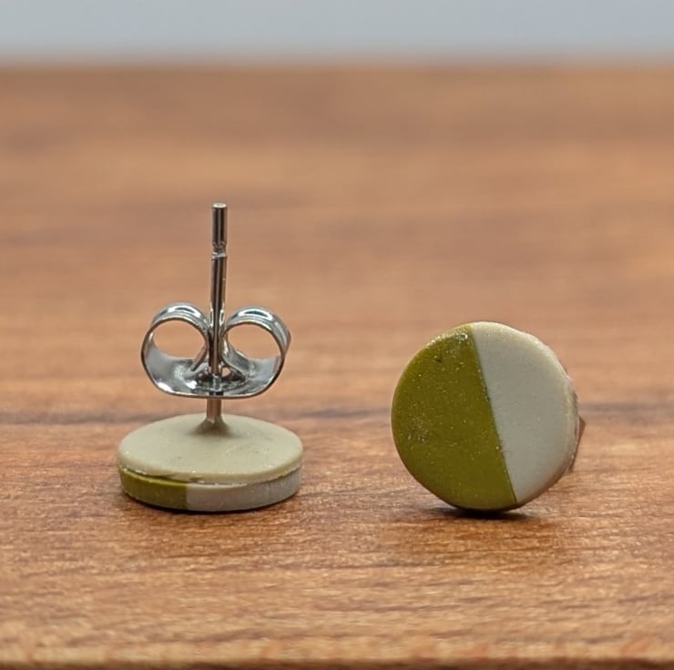 Light olive green and stone effect stud earrings measuring 8 mm diameter and are handmade using polymer clay.