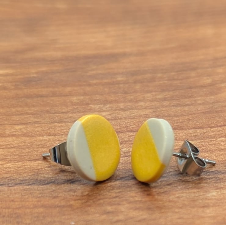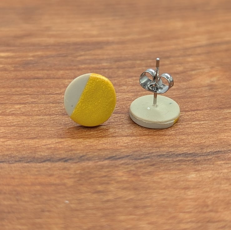 These studs measure at 1cm diameter, the stainless steel post is embedded in the same natural toned polymer clay.