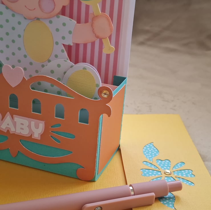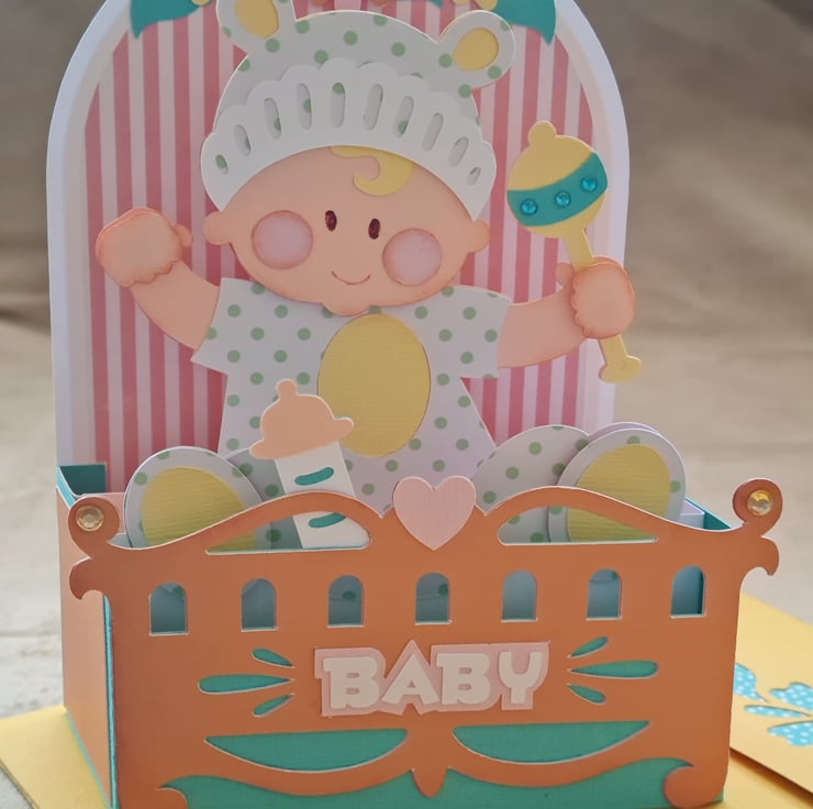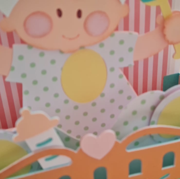 Welcome a little bundle of joy with this charming pop-up card, featuring a snuggly baby nestled in a crib. With its three-dimensional design and gentle colours, it's the perfect way to say "Hello, little one" in the most delightful way.