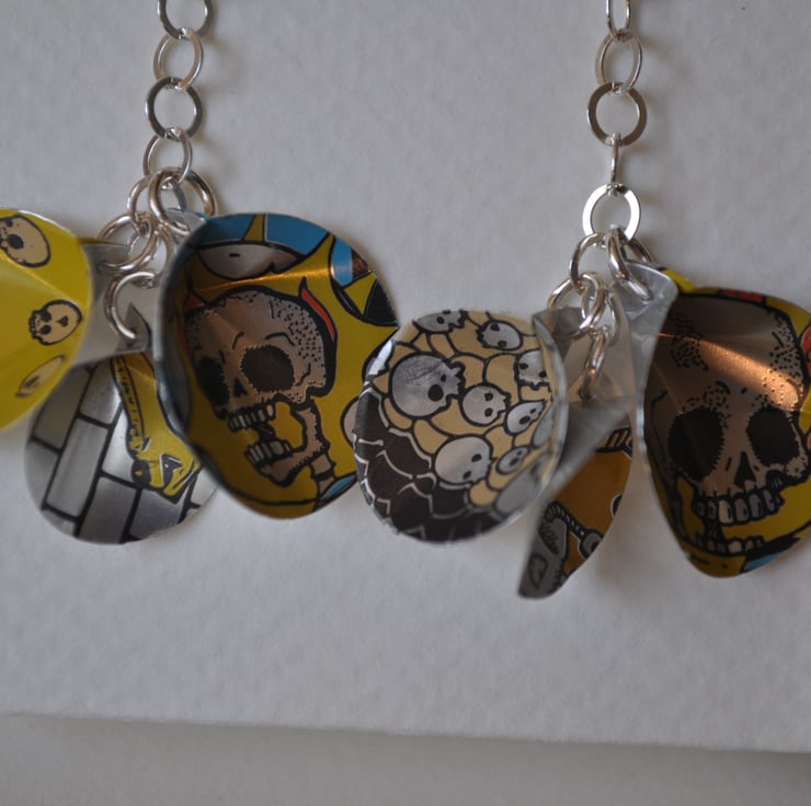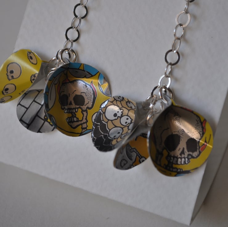 This jewellery is handmade from recycled craft beer cans and 925 sterling silver. I cut up the cans before washing the metal. Next I stamp the elements, and file, shape and drill them. Then I work out a design, before assembling them into unique pieces which are lightweight and comfortable to wear.