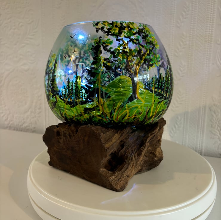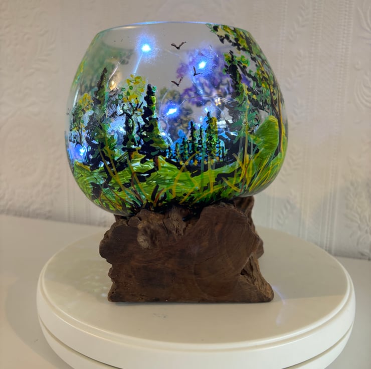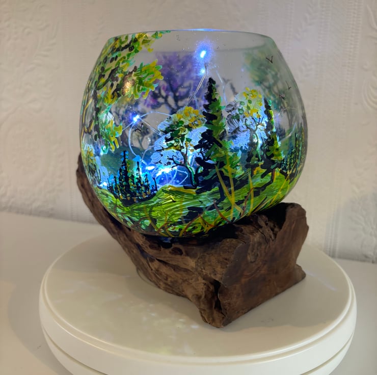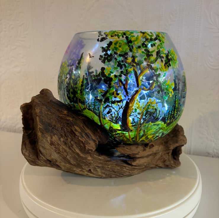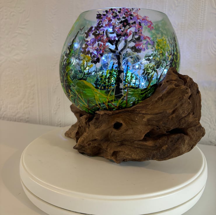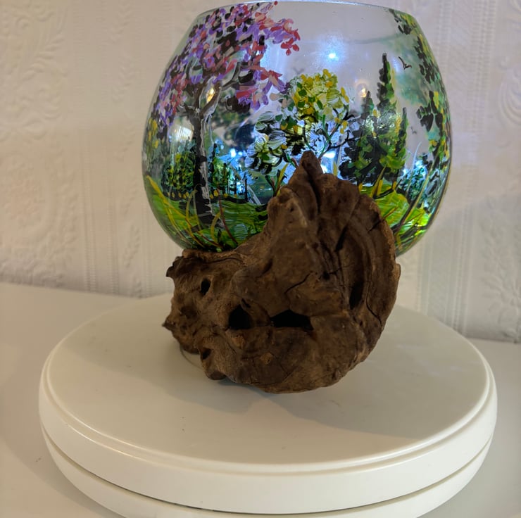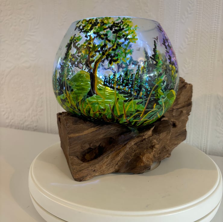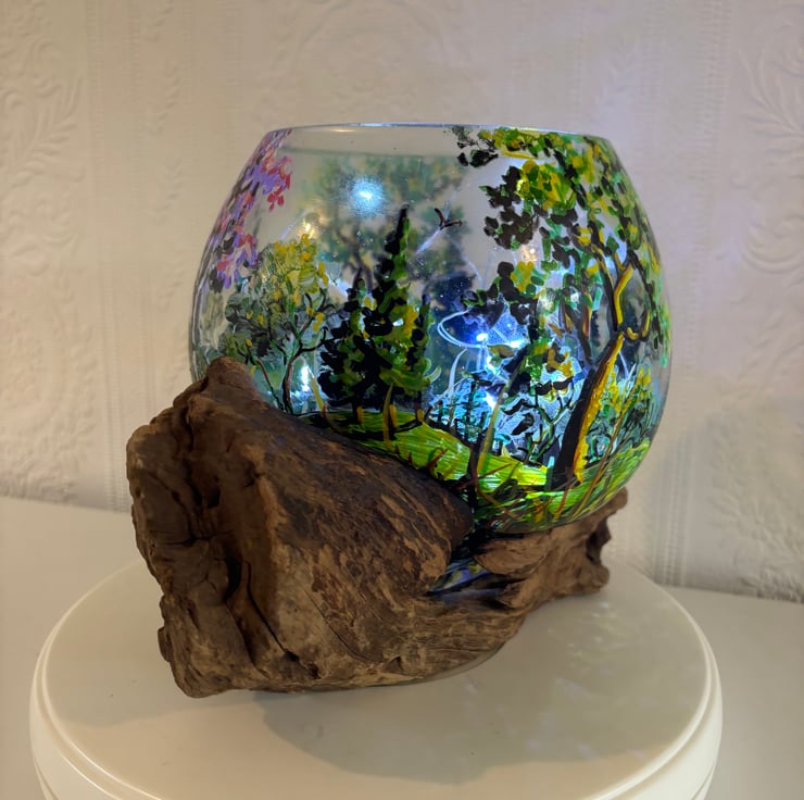 A hand painted and fired glass bowl on driftwood by Andrew Jenkins