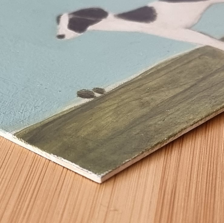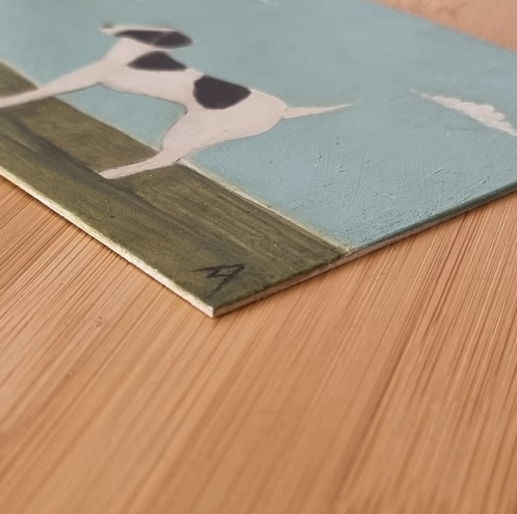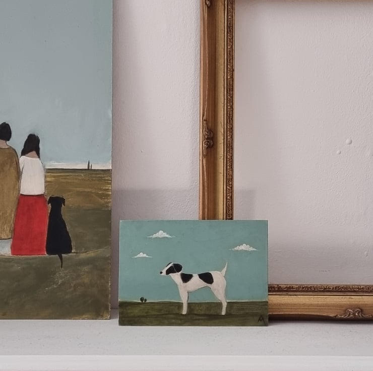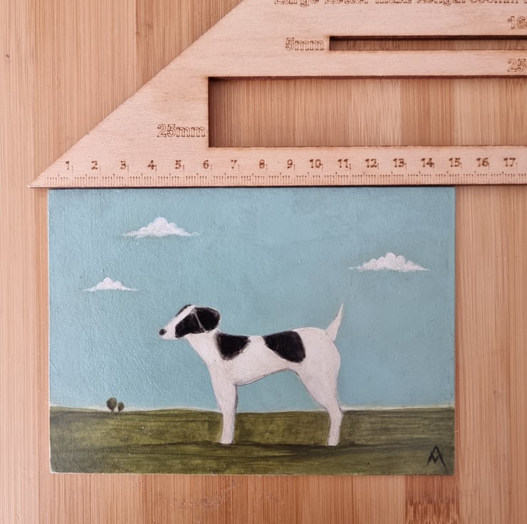 A small original painting of a cute little black and white dog in the countryside. A sweet gift for dog lovers, art collectors or a small piece of wall art.