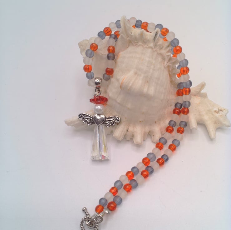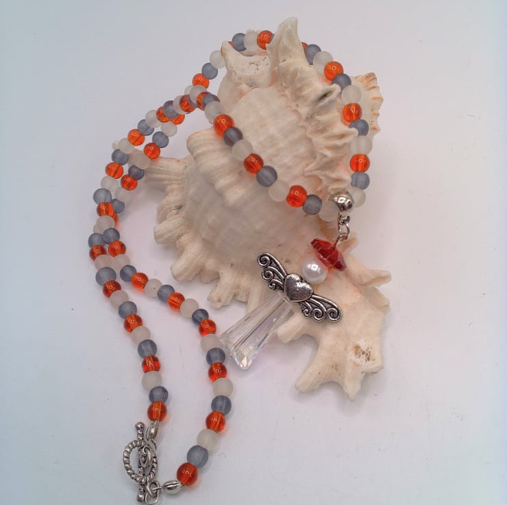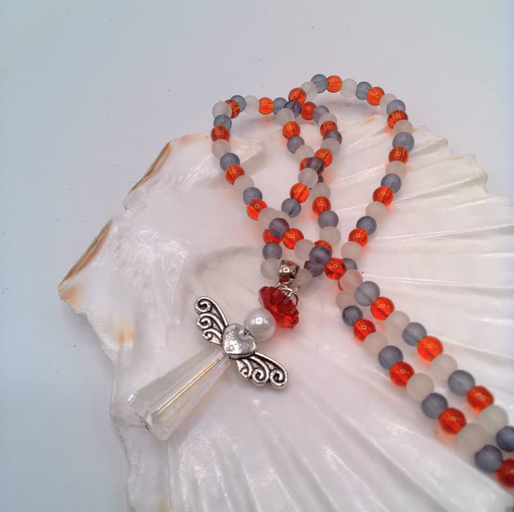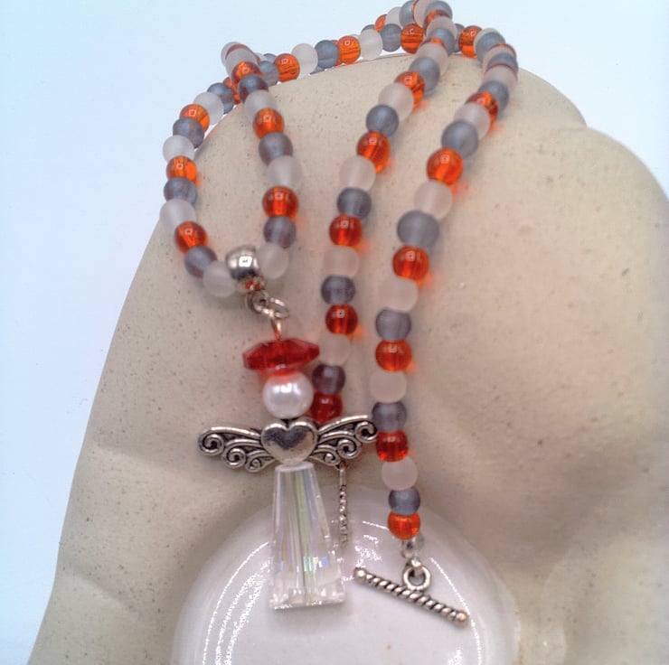 This pretty Christmas Angel pendant on a red white and black beaded necklace would look great with any outfit you wear for a day party, or an outfit for Christmas time. It would make a lovely gift for a friend or relative for a birthday or Christmas, or a treat for yourself. The pretty Christmas angel pendant measures 40 mm from top to bottom and 25 mm from wing tip to wing tip. The pendant is made using silver plated angel wings, a cream glass pearl bead, a red round flower crystal and a clear crystal long bead for the skirt. The angel pendant is suspended on a beaded necklace made using small 4 mm black, white and red round beads. It has a silver plated toggle clasp and the bail is also silver plated. The necklace measures 15 inches (38.5 cm) in length and it is fastened with a silver plate toggle clasp. The necklace will be dispatched wrapped in tissue paper in an organza bag and delivered to you via Royal Mail 1st class post.