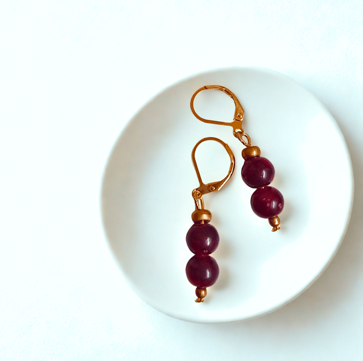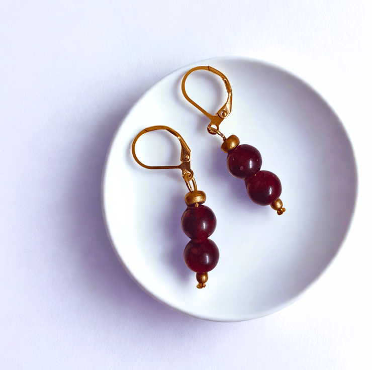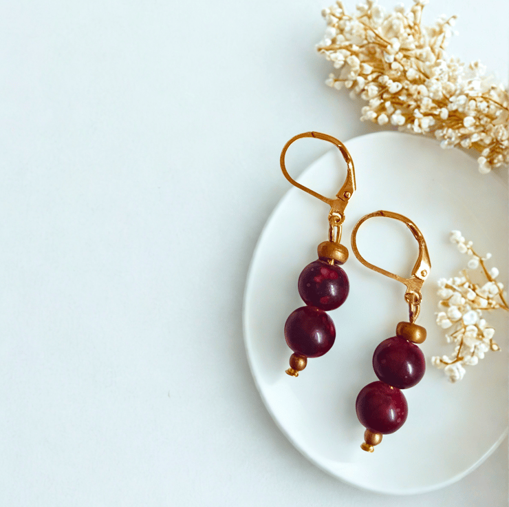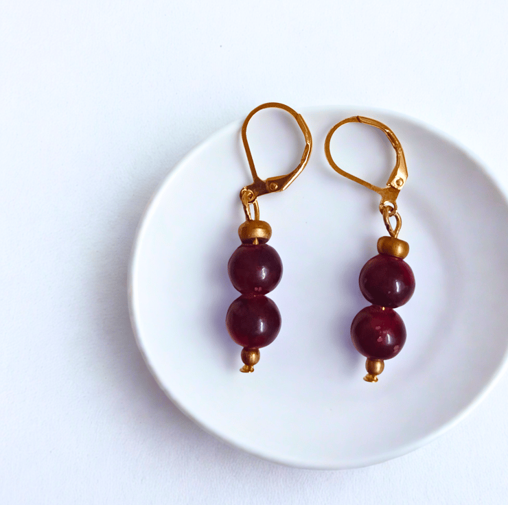 Beautiful autumnal deep reddish brown berry like glass beads together with antique gold and tiny glass beads. Hanging on nickel free gold plated lever back hooks.