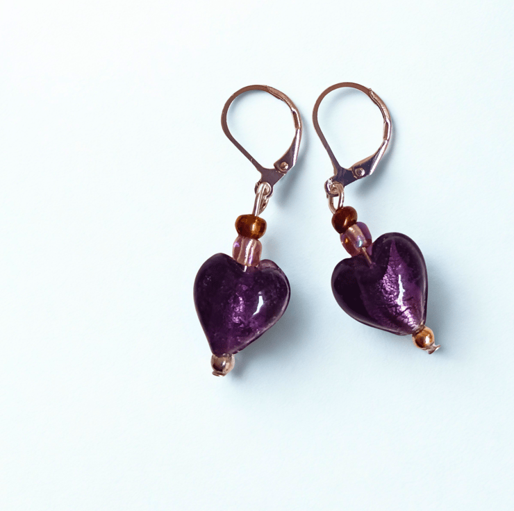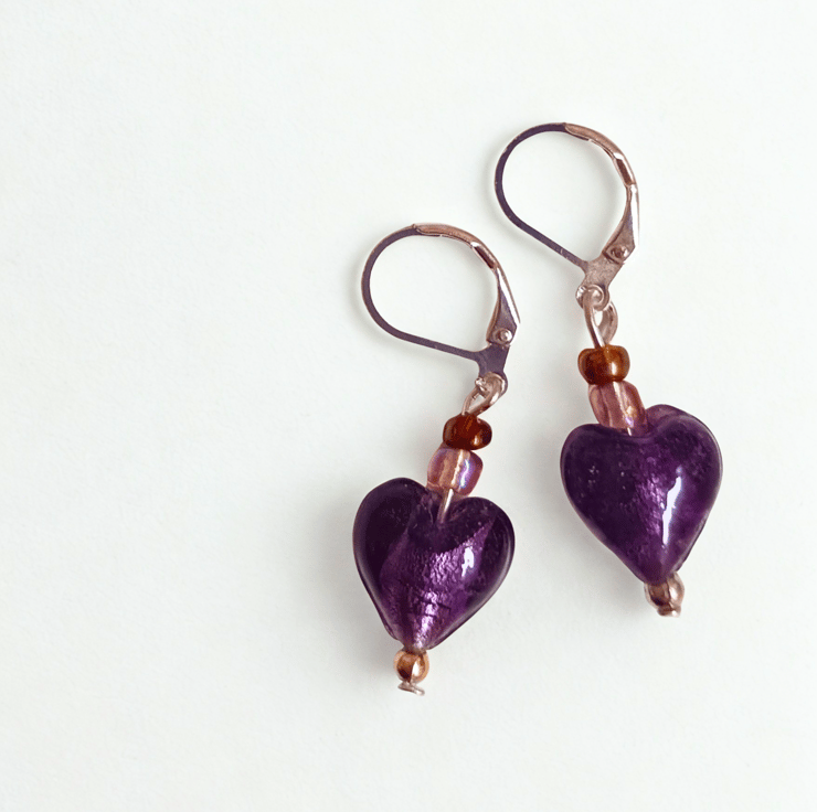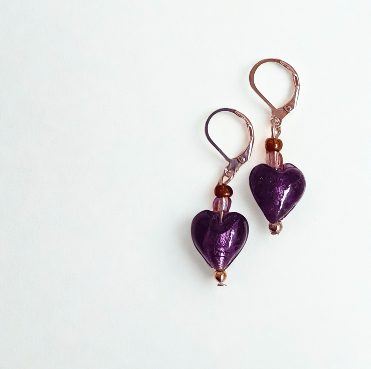 Gorgeous deep purple glass hearts with tiny glass beading in smoky pink and ash grey, hanging on 925 silver lever back hooks.