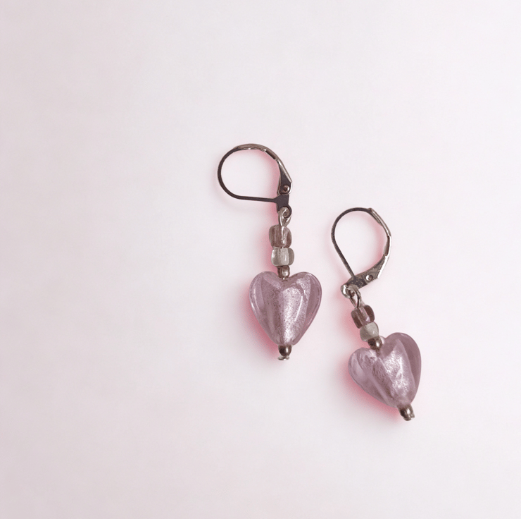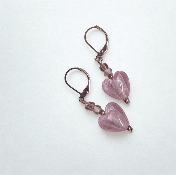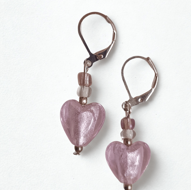 Icy pink glass hearts with tiny glass beads hanging on comfortable and secure nickel free 925 silver lever back hooks.