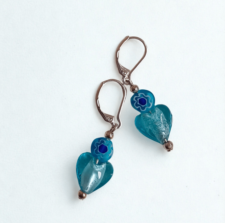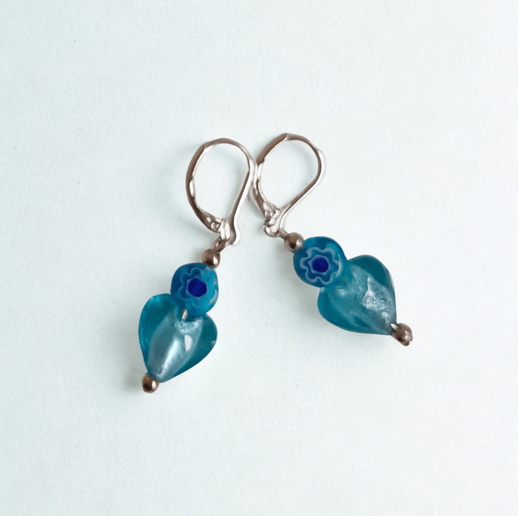 Beautiful turquoise blue glass hearts, pretty and light. Blended with tiny navy glass beads and millefiori lampwork beads.So pretty and hanging on comfortable and secure nickel free 925 sterling silver hooks.