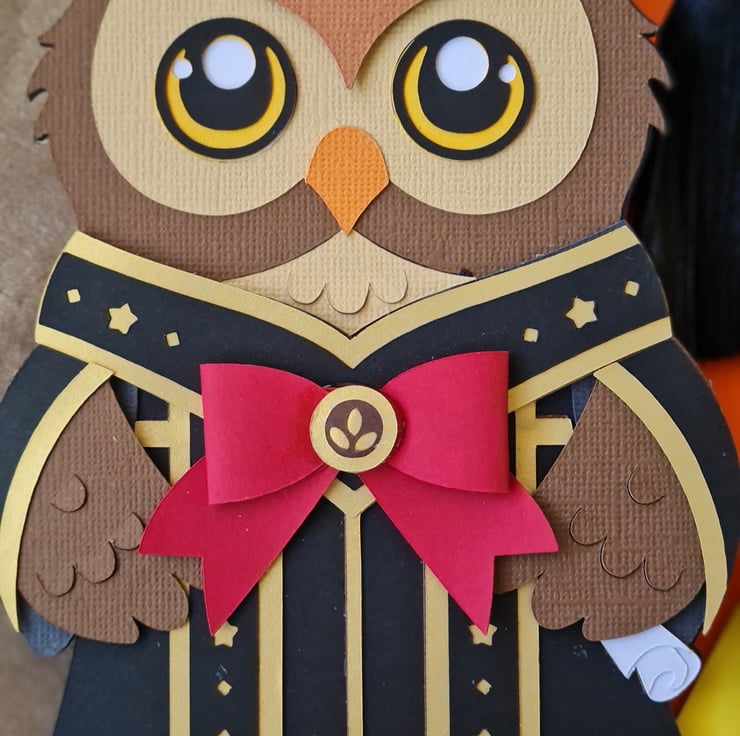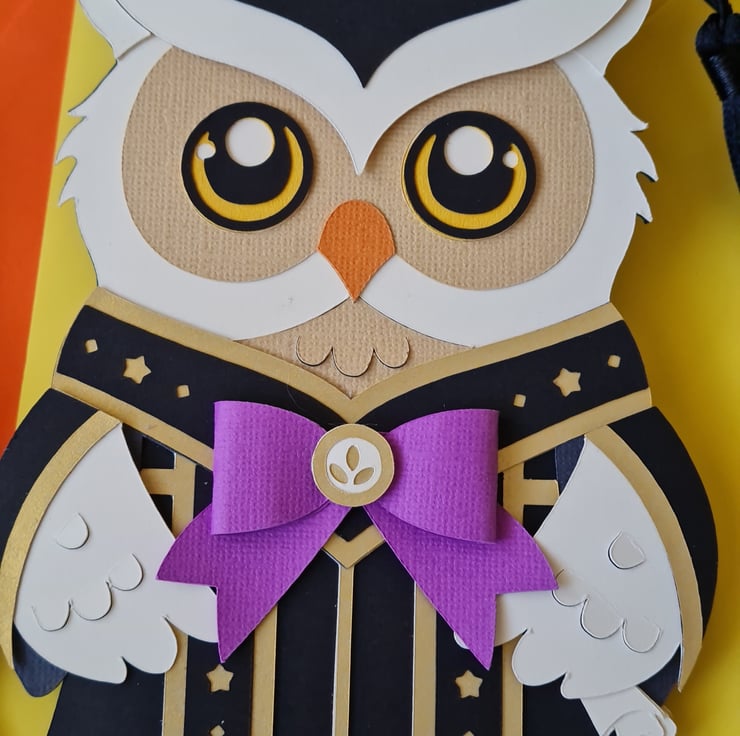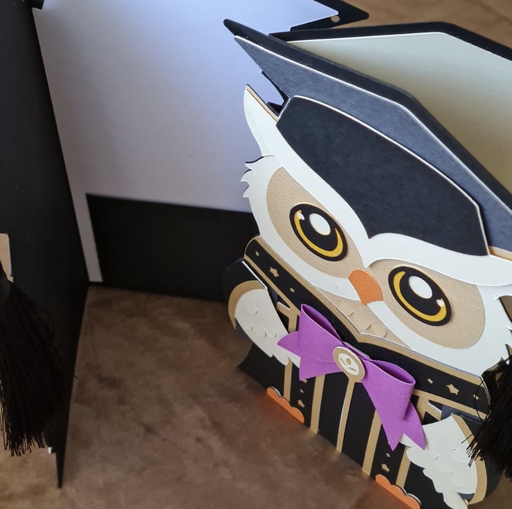 Send a hoot of congratulations with this smart and stylish owl graduation card, handmade with layered card and topped with a tassel. From the charming owl in a cap and gown to the bow tie and starry details, this card celebrates graduation with wisdom and whimsy.