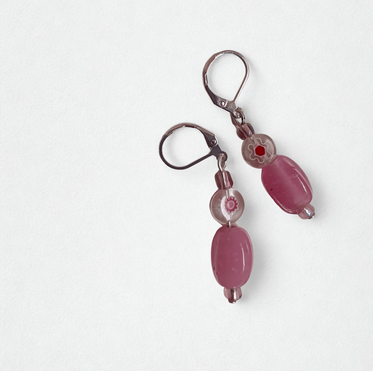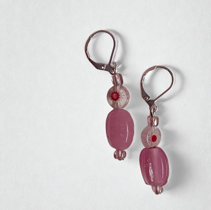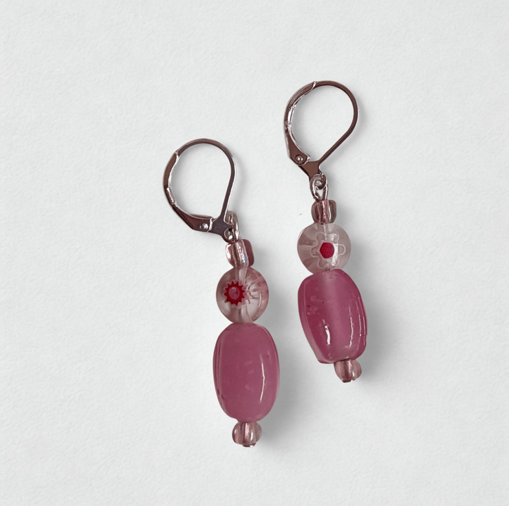 Little lightweight pink glass blocks, with the corners smoothed, rounded off and polished. Blended with round millefiori lampwork designed beads with a tiny flower in red, white, pink and clear glass. Hanging on comfortable and secure nickel free 925 sterling silver hooks.