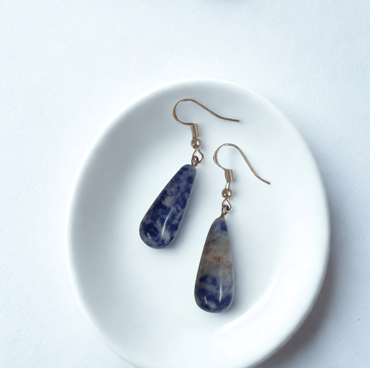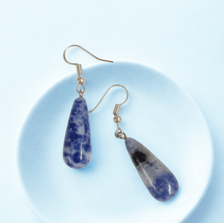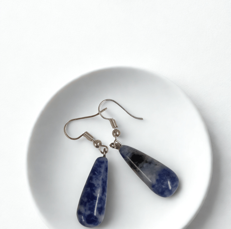 Lightweight polished Sodalite blue teardrop earrings. Taken from a necklace I am taking a guess that these stones are blue Sodalite but in any case I love the teardrop shaped as earrings and the cloudy blue of the stone. Hanging on nickel free 925 sterling silver hooks.