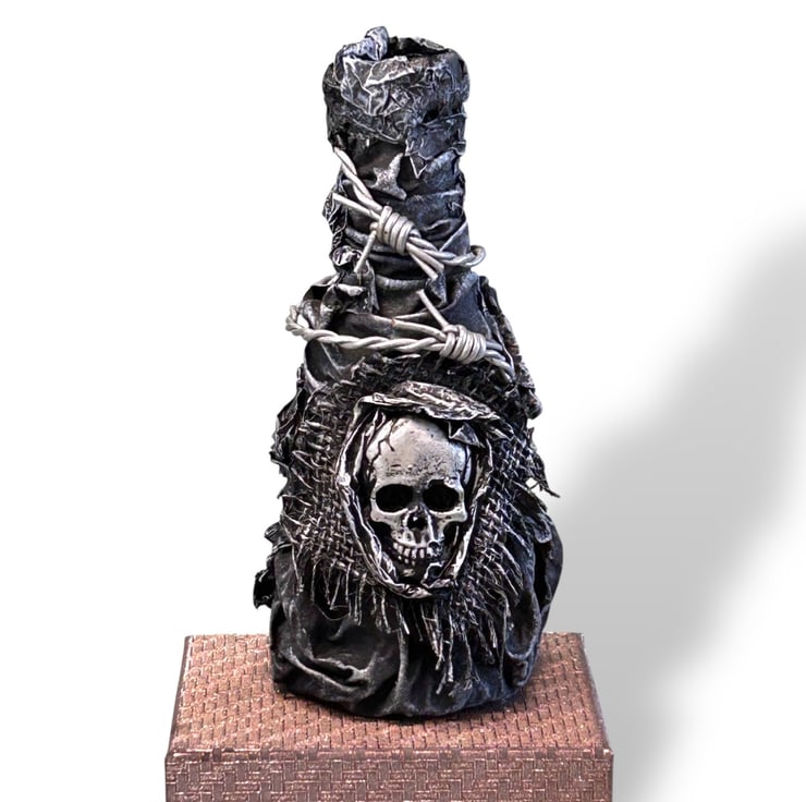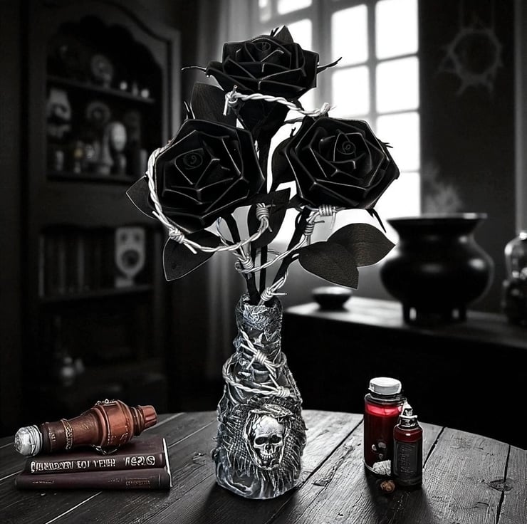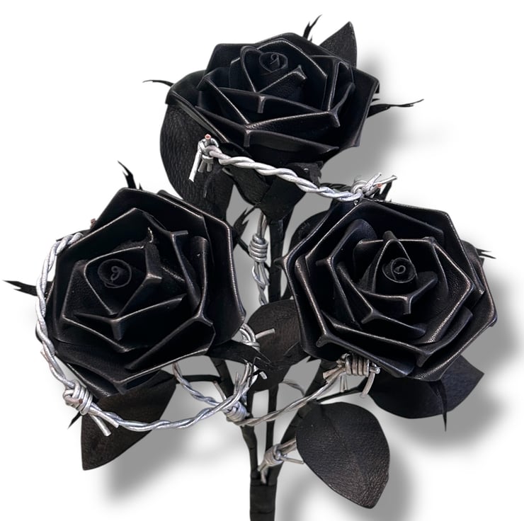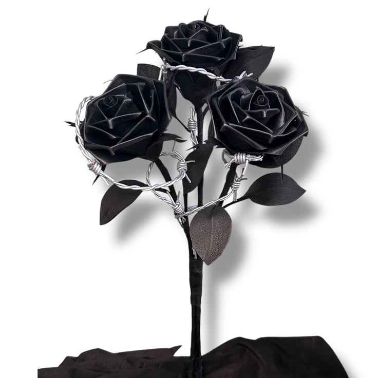 This striking arrangement features three black leather roses, each carefully shaped by hand and entwined with twisted faux barbed wire. The roses sit in a textured gothic-style vase, detailed with a skull and more wire wrapping for a moody, powerful finish.