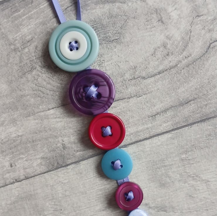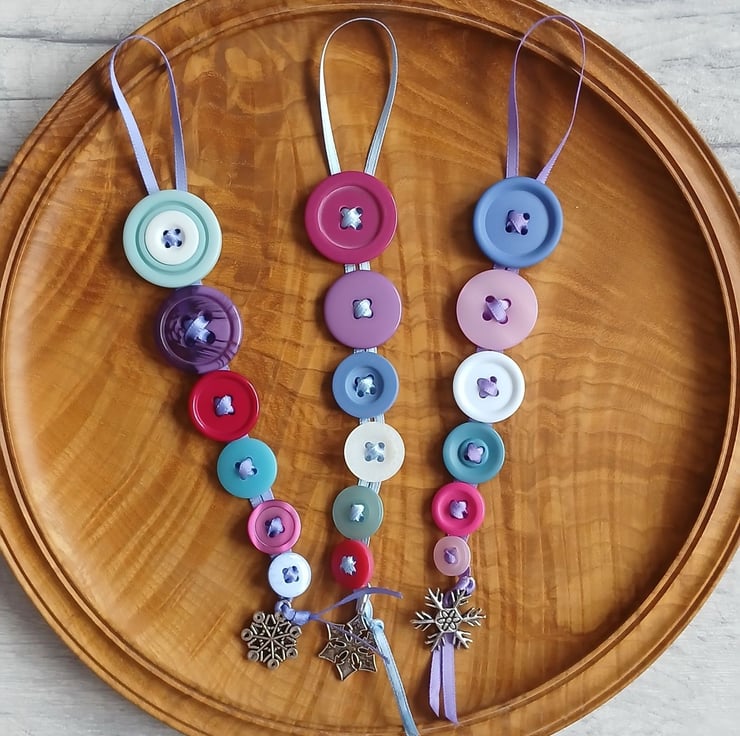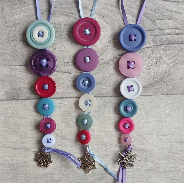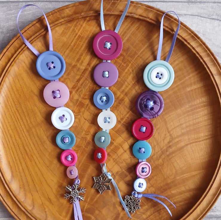 Three Christmas decorations made from graduated sets of buttons in frosty shades of blue and pink threaded onto ribbon and finished with pretty snowflake charms. Each dangle is unique and measures about 15 cm long, not including the hanging loop.