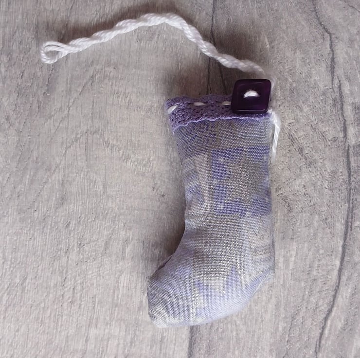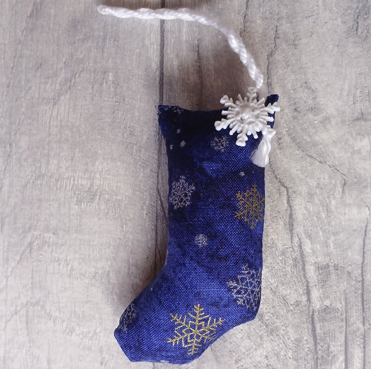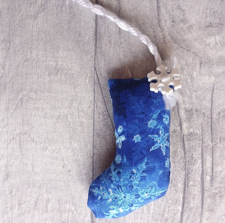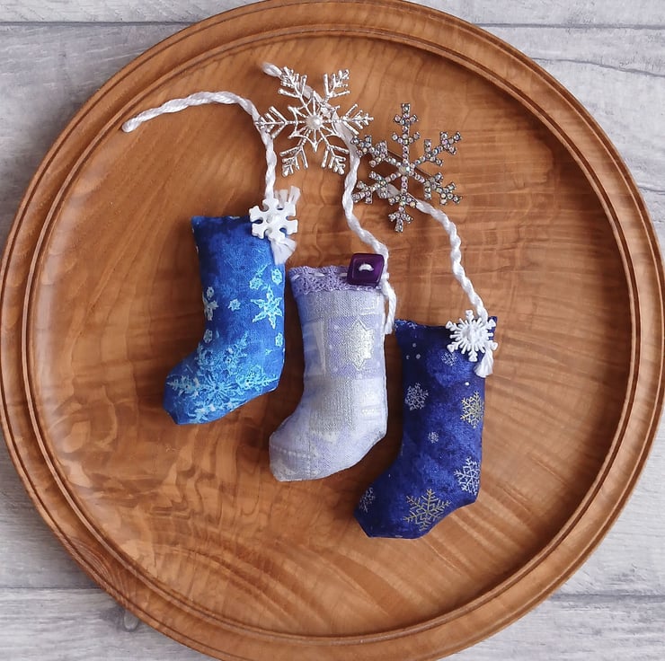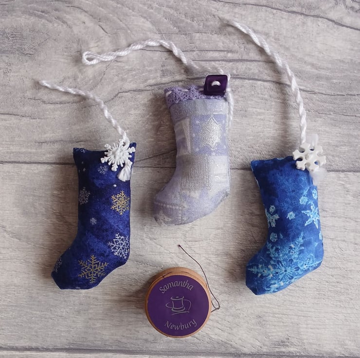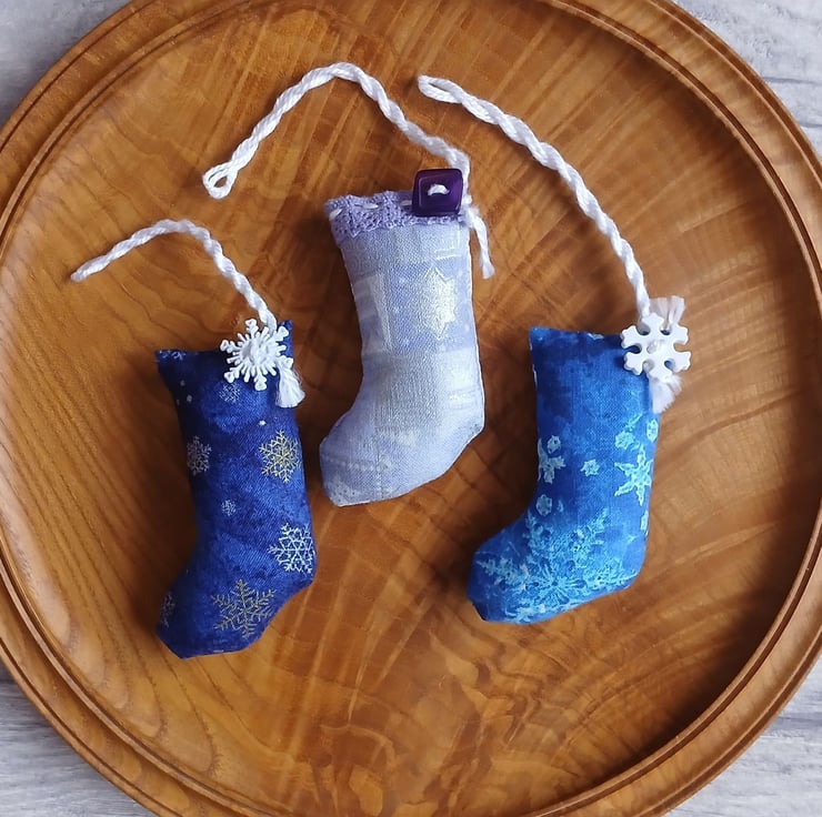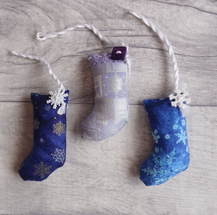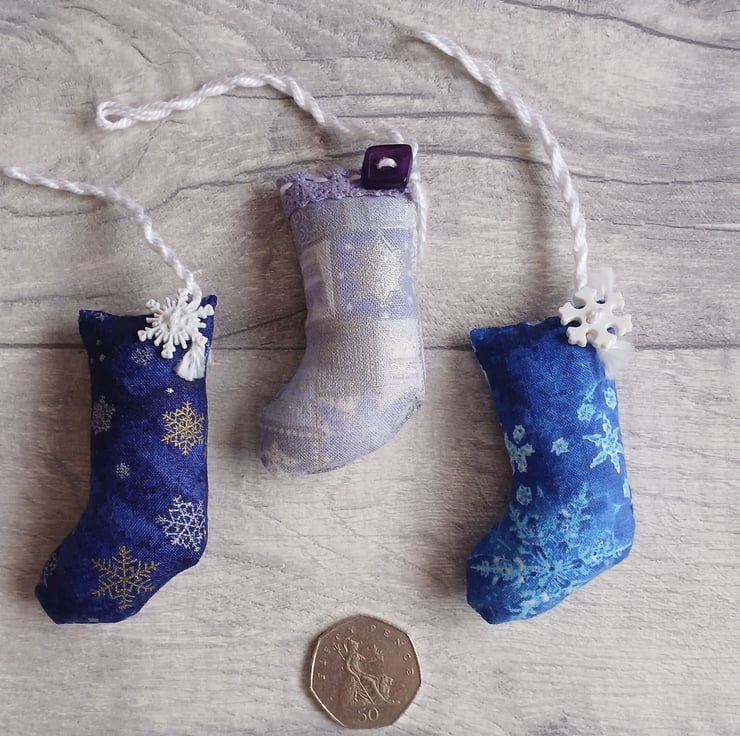 A set of three frosty coloured mini Christmas stocking decorations. Just 7 cm tall, each stocking is lightly stuffed and finished with coordinating buttons and twisted thread hanging loops.