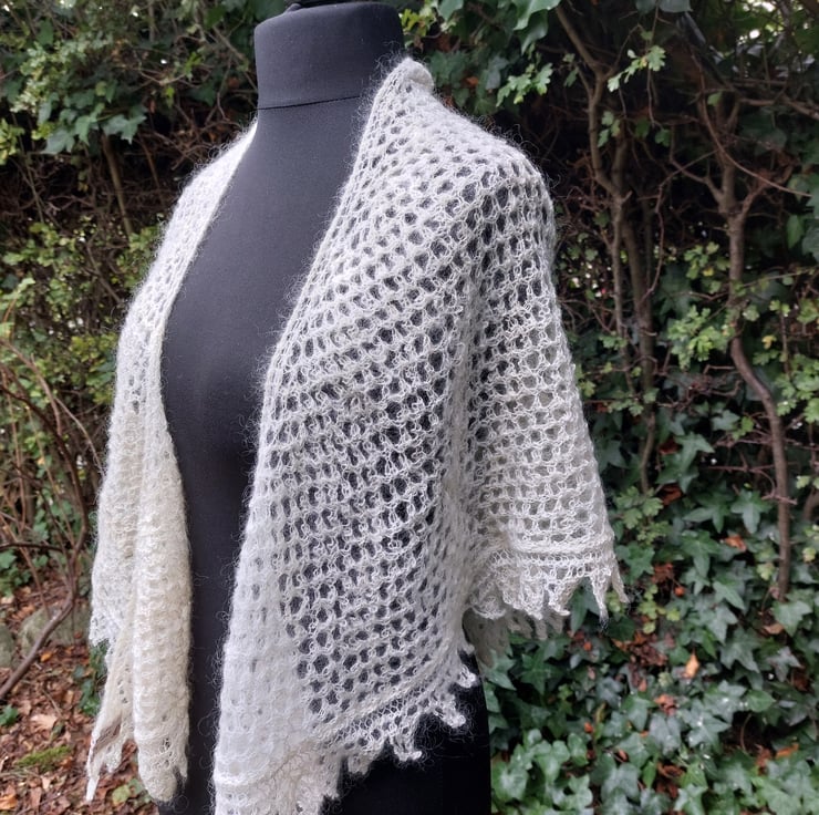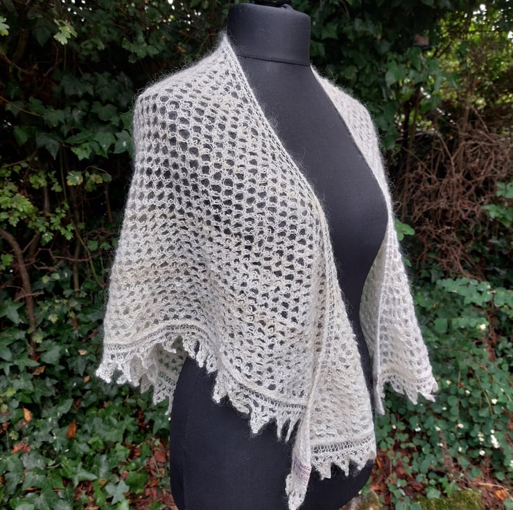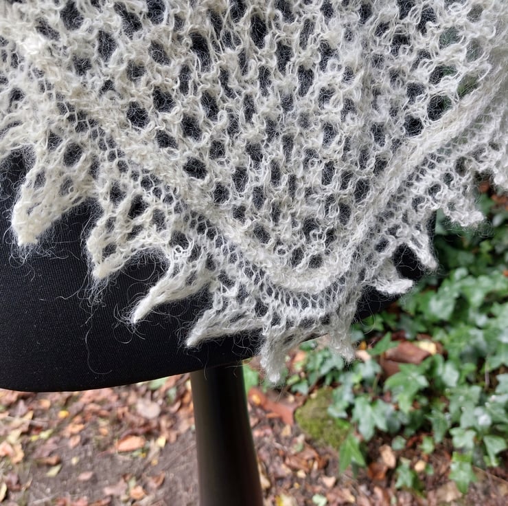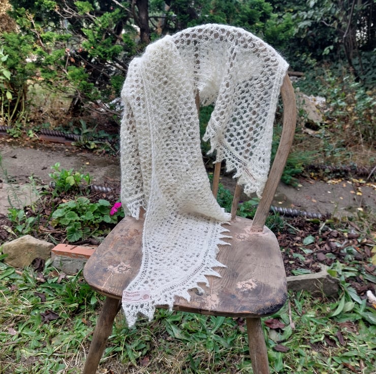 I knitted the shawl in a variation of the ‘Vandyke’ Shetland Lace pattern. I call the shawl style ‘Heidi', after one of the Angora Goats I used to have years ago when I lived in Orkney. I like to name my designs after the various pets I've had - it's a lovely way to remember them.