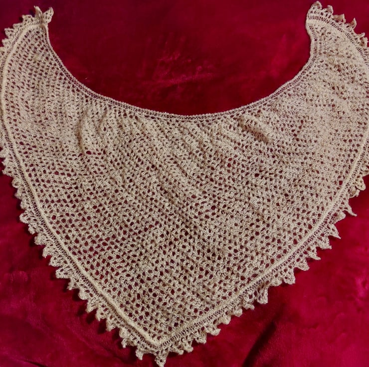 This handspun light-weight shawl is hand-knitted in a ‘Vandyke’ lace pattern, inspired by old Shetland lace. It has a ‘Vandyke’ border along the two lower edges.