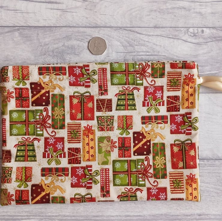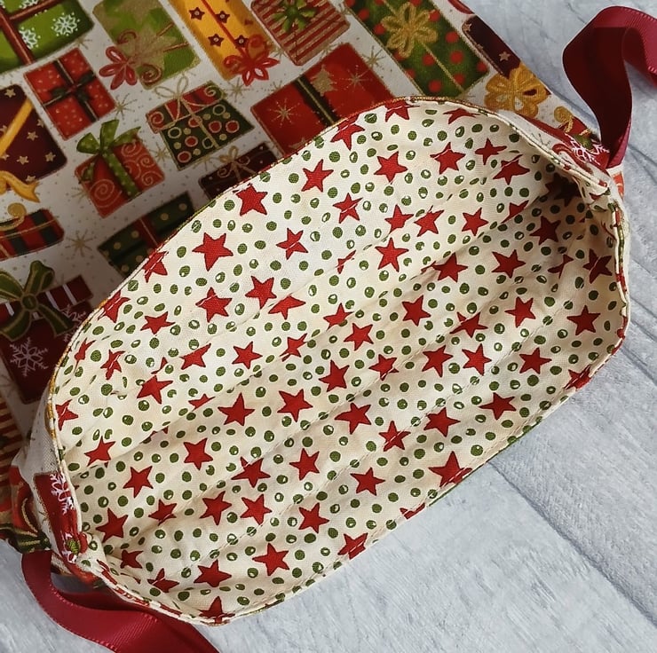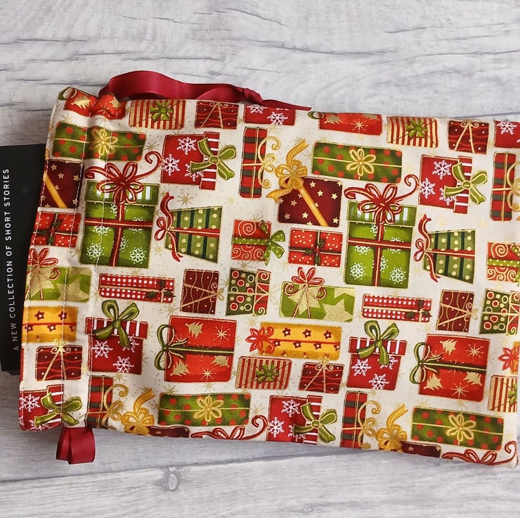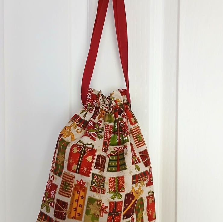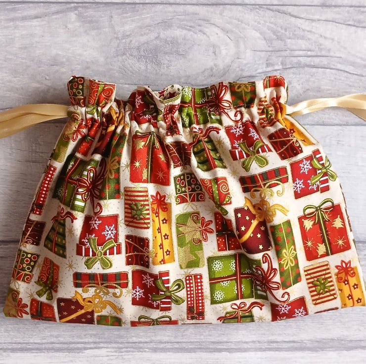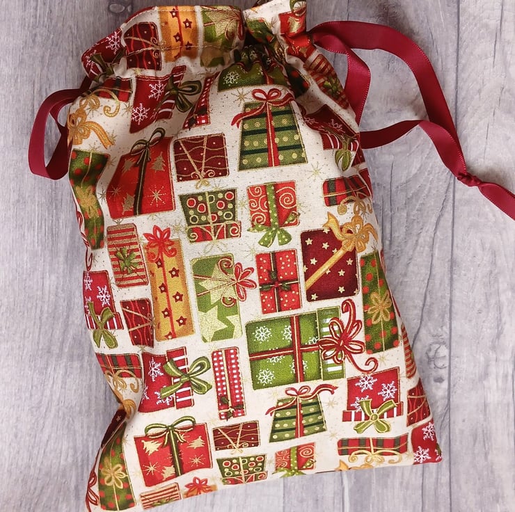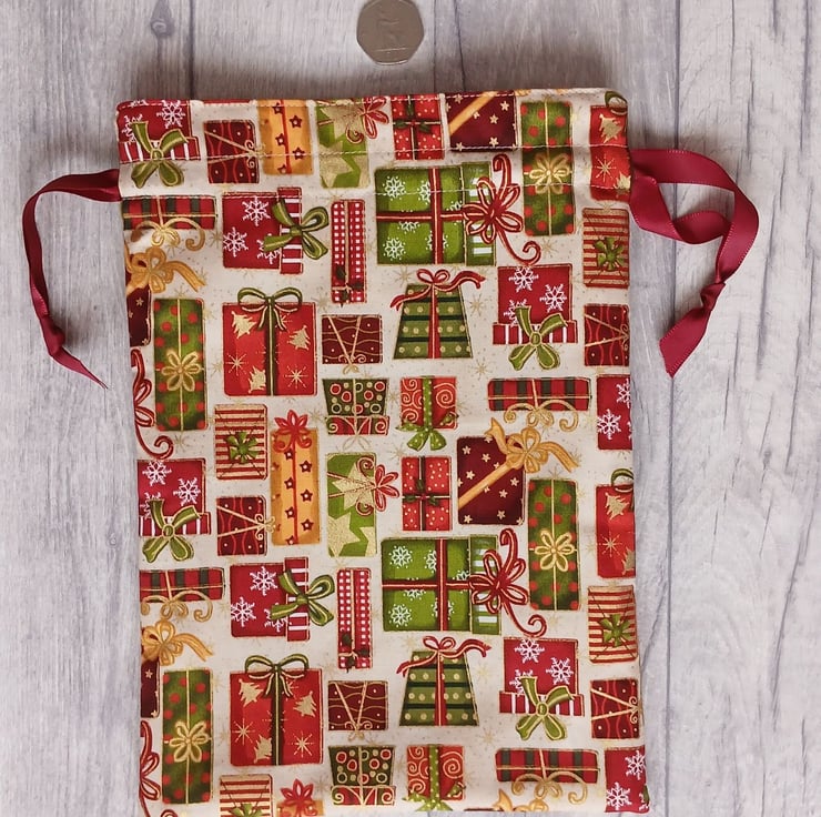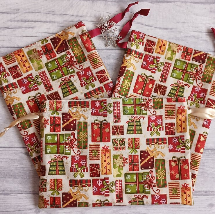 A set of handy reusable, drawstring, fabric gift bags in a fun parcel print picked out in metallic gold. Each bag is lined with a print of red stars and green spots on cream. There are two 'portrait' bags (approximately 29 cm tall x 20 cm wide) with burgundy ribbon drawstrings and one 'landscape' bags (29 cm wide x 20 cm tall) with gold ribbon drawstrings. Ideal size for a paperback or several small gifts.