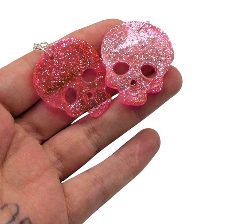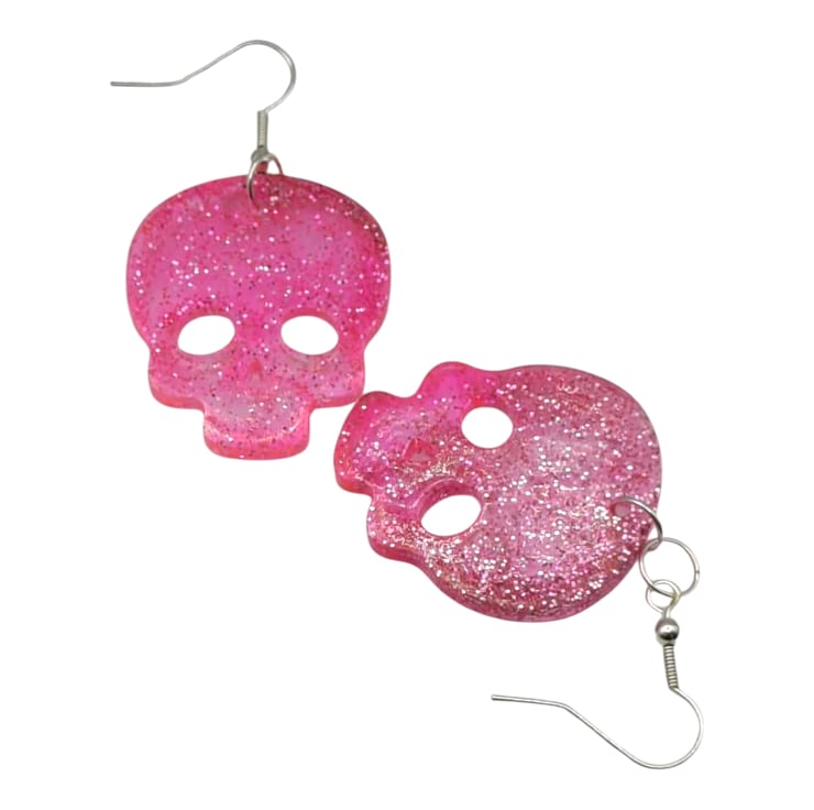 Handcrafted from lightweight resin, these earrings feature pink glitter skulls that shimmer with every move. Designed for all-day comfort, they hang from silver-plated ear wires, making them easy to wear and gentle on your ears.