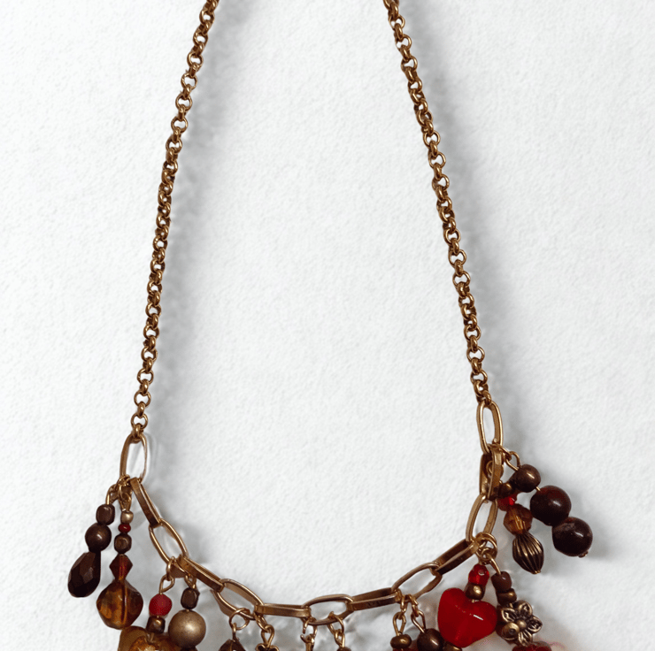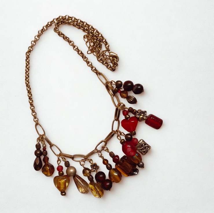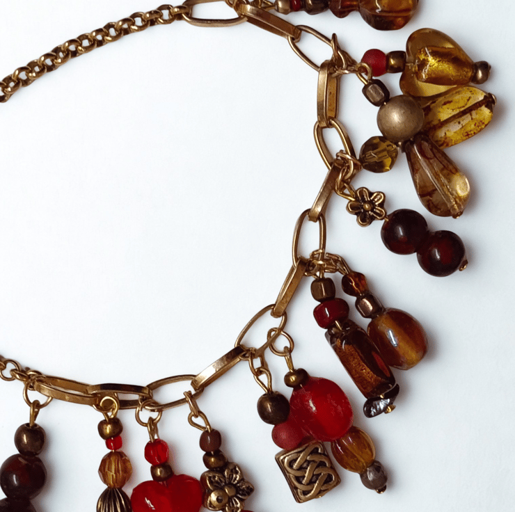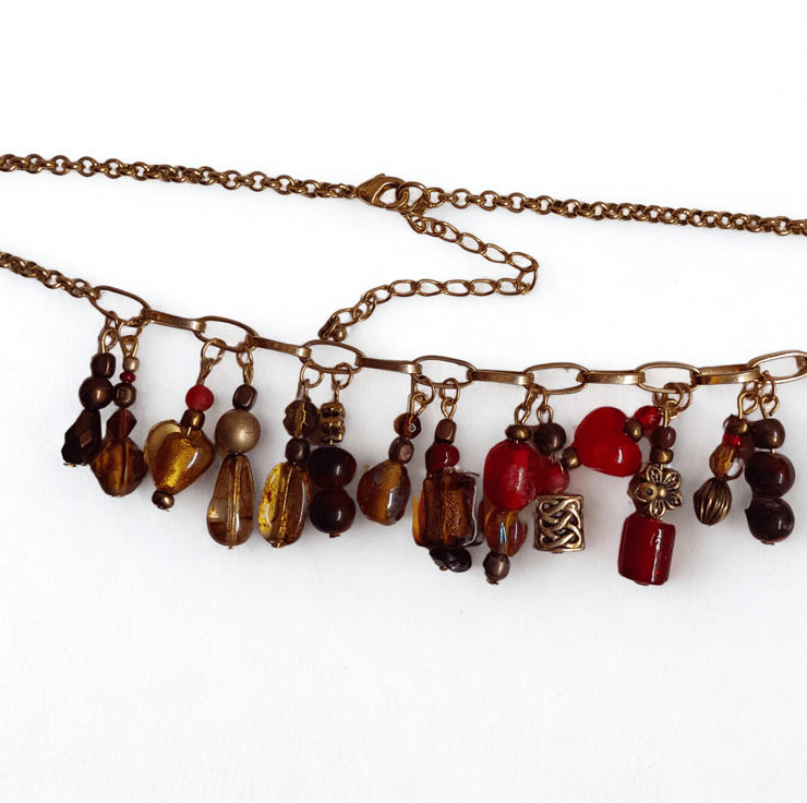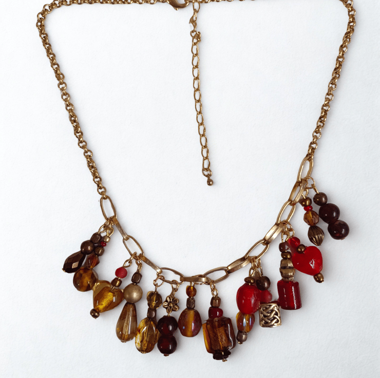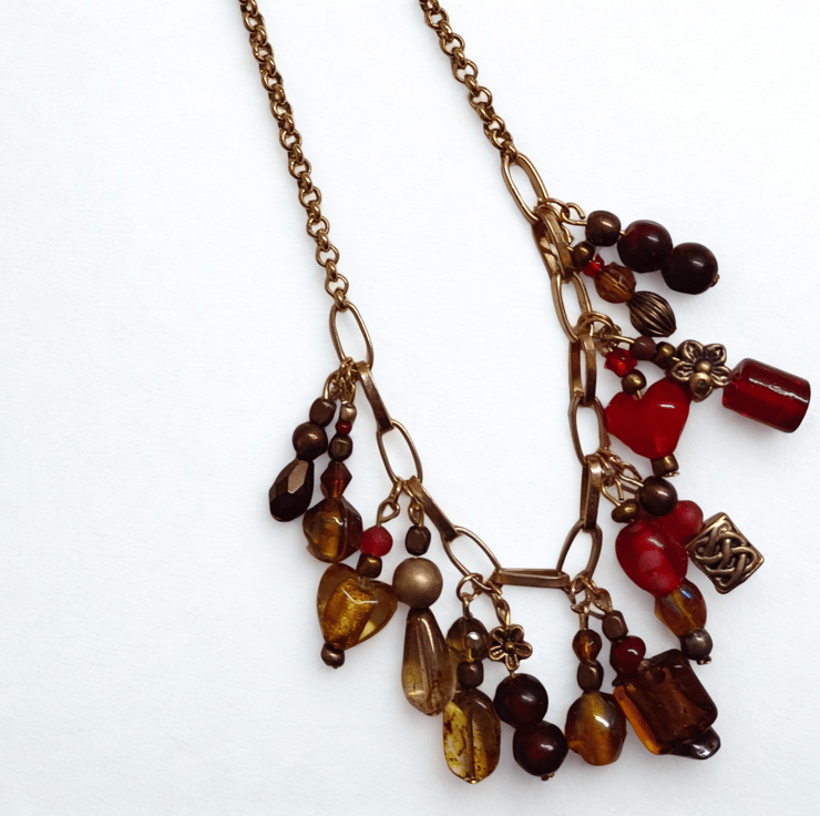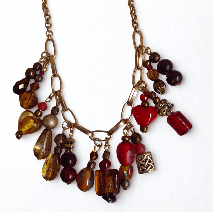 From a vintage necklace I found a gold plated chain with a lobster catch, 16 inches long with an extra 3 inches of chain for adjustments. I found as many interesting beads as I could in Autumnal shades of russet, berry, brown, gold deep red, bronze and crafted multiple short strands of beading attached to the central wider chains. The resulting necklace is just as I imagined and looks wonderful on.