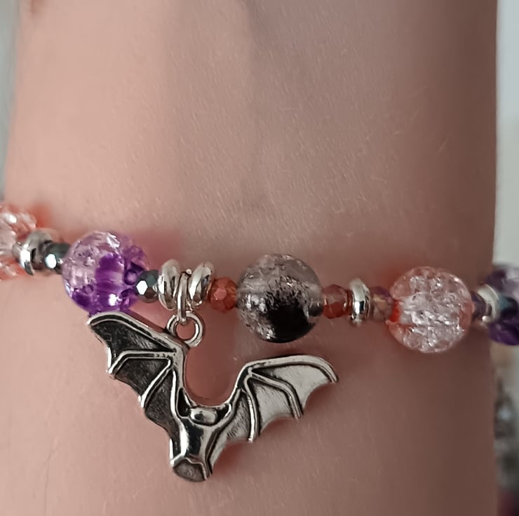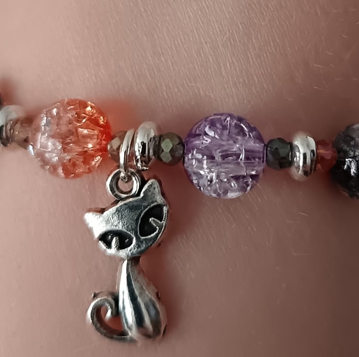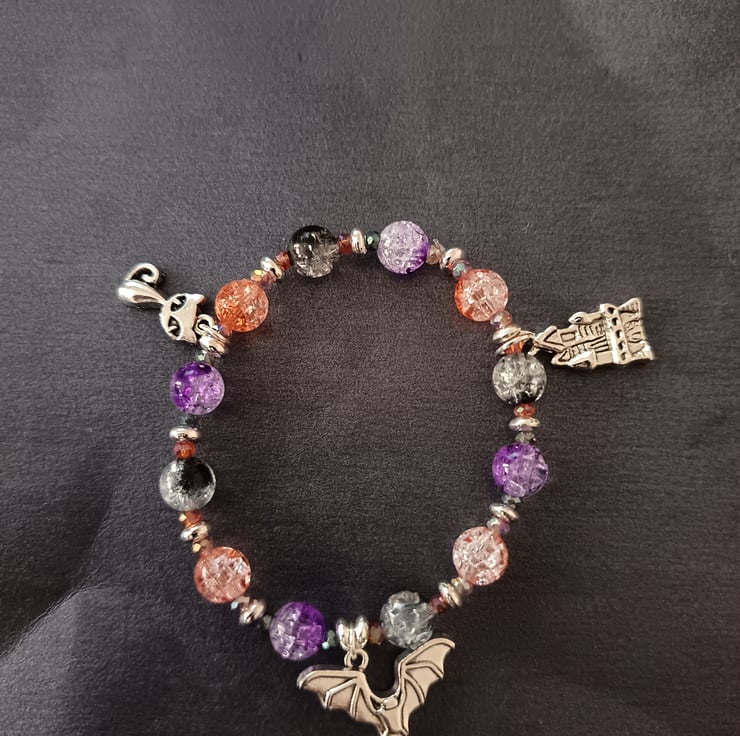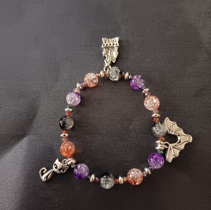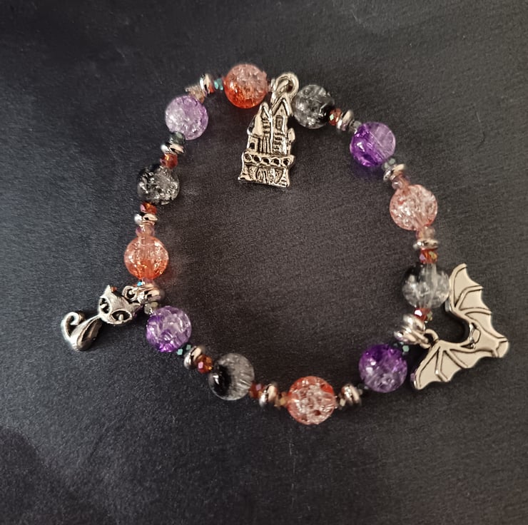 This handmade bracelet is crafted with magic stretch elastic and uses decorative silver spacers as well as a variety of beads in different sizes and pastel Halloween colours (black, orange and purple). Three silver charms depict a haunted house, a bat and a cat. Gothic, alternative vibes, measuring approximately 7 inches