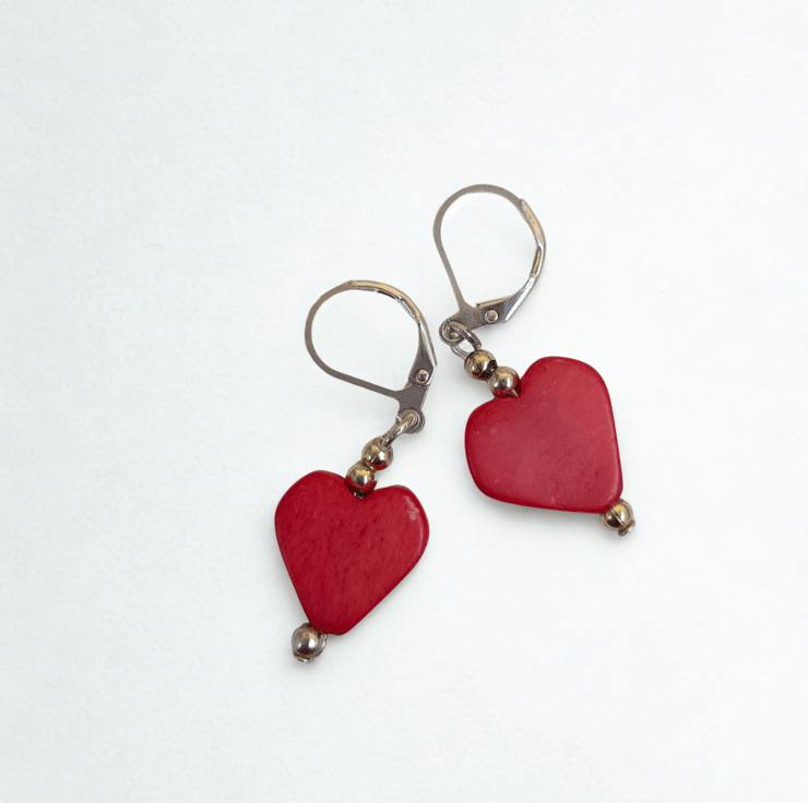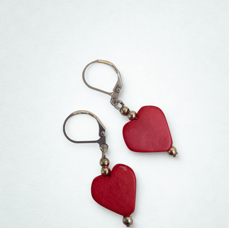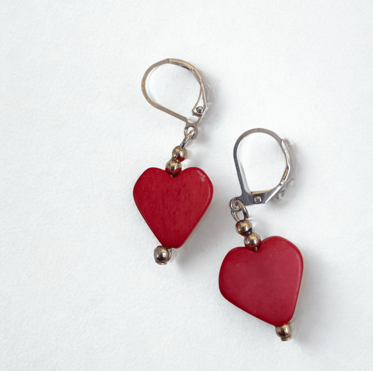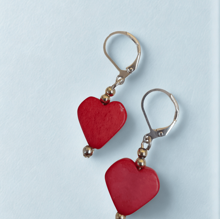 Lovely red wooden hearts blended with tiny silver beads and hanging simply on comfortable and secure 925 sterling silver lever back hooks.
