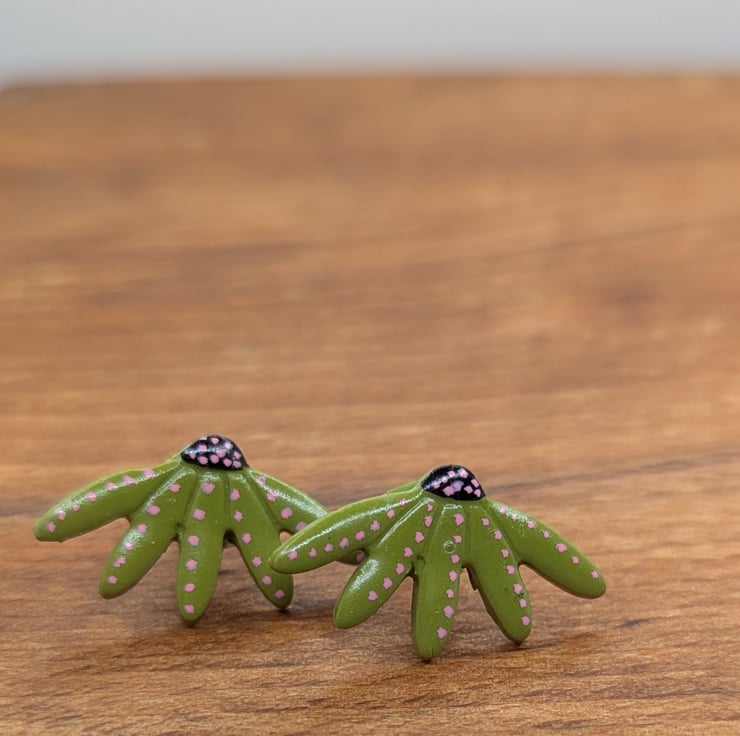 Half flower stud earrings made with a beautiful shade of olive green with added detail. These earrings are made with polymer clay which makes them very lightweight and comfortable to wear from day to evening.