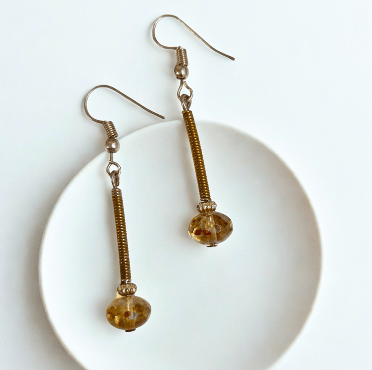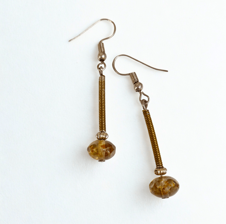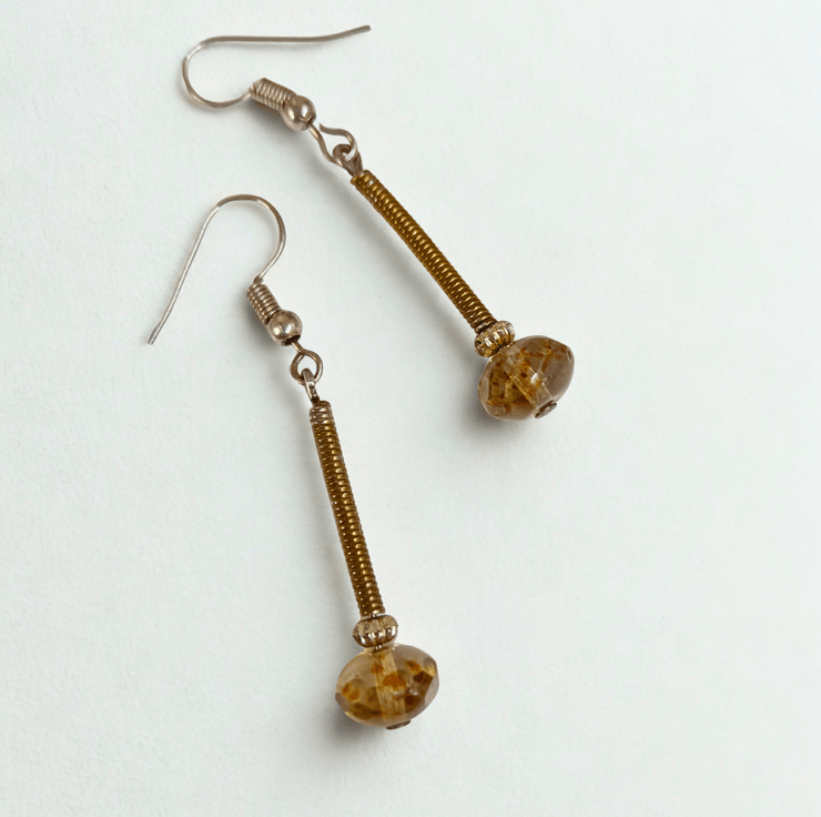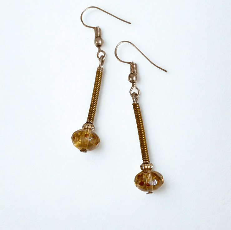 Little amber glass crystal beads hanging on long spiral wires and hanging on nickel free 925 sterling silver traditional hooks.