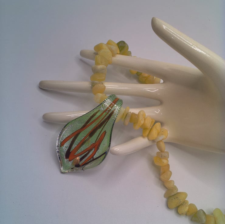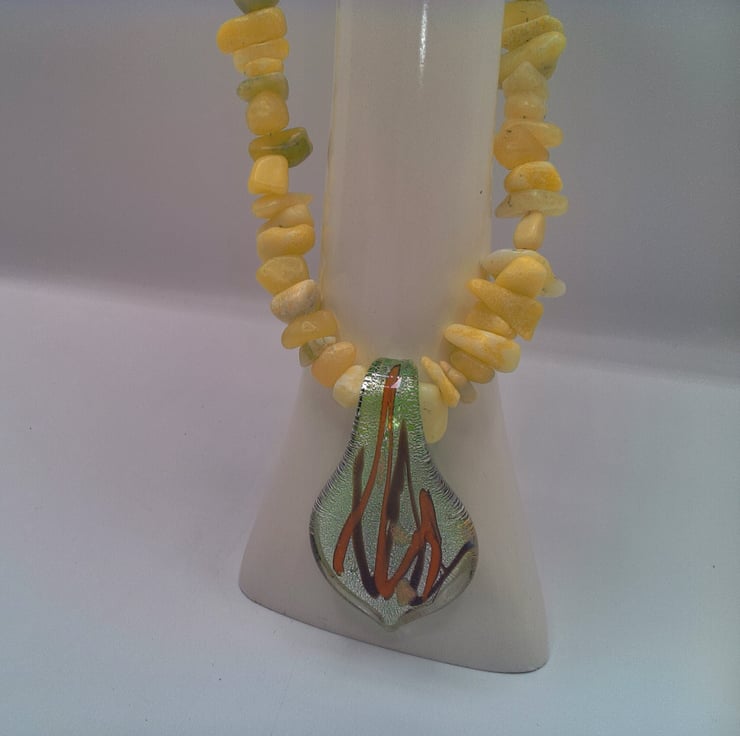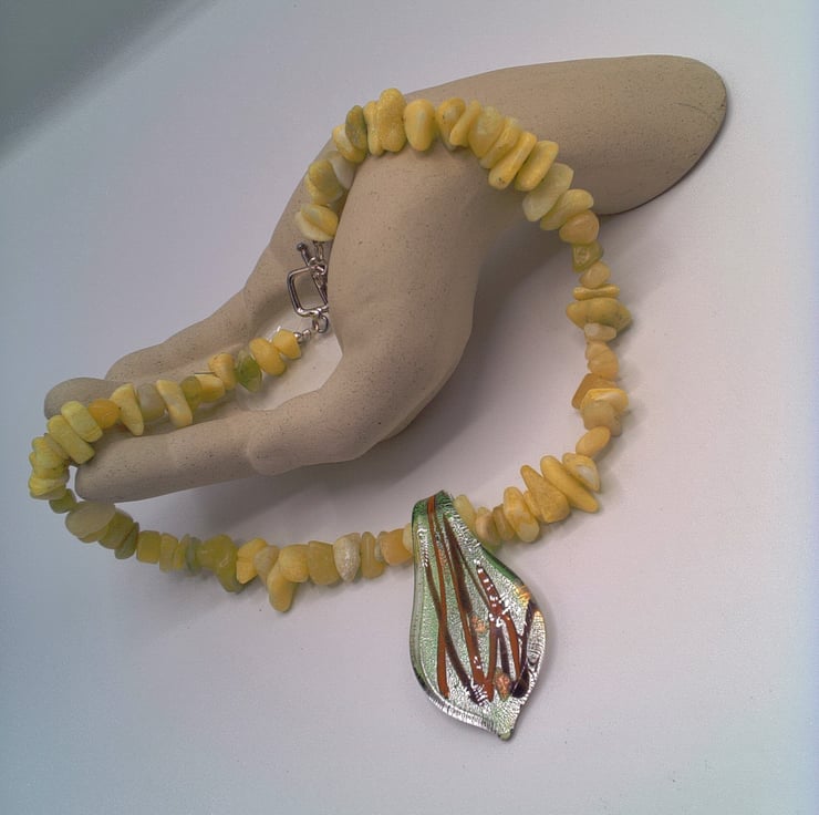 This gorgeous summery necklace would look great with any outfit you choose to wear for everyday or for an evening out. It would make a great gift for any fun loving lady who loves to lunch, for a birthday or anniversary, or as a treat for yourself. The green brown and gold glass Tear Drop shaped Pendant measures 55 mm from top to bottom and 30 mm wide. It is suspended on a beaded necklace made with green faux jade chip beads. The necklace is 18 inches (46 cm) in length and is fastened with a silver plated square toggle clasp. The necklace will be dispatched wrapped in tissue paper in an organza bag and will be delivered to you via Royal Mail first class post.