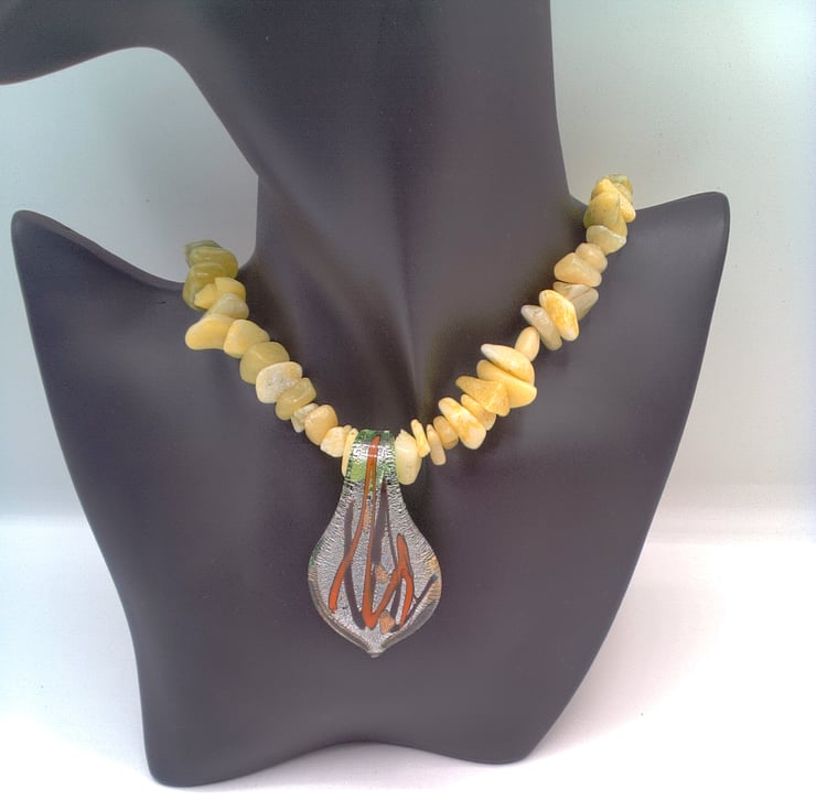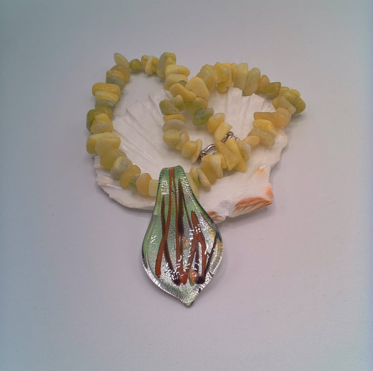 Green Brown & Gold Glass Teardrop Pendant on a Green Faux Jade Bead Necklace, Green Glass Necklace, Ladies Jewellery, Ladies Accessories, Birthday Gift, Anniversary Gift, Mother's Day Gift, Gift for Her, Glass Pendant, Faux Jade Chip Necklace