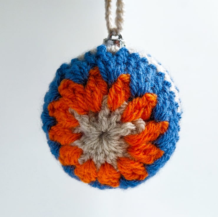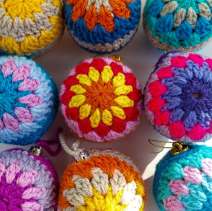 Shatterproof baubles have been given little crochet jackets, in bright colours.